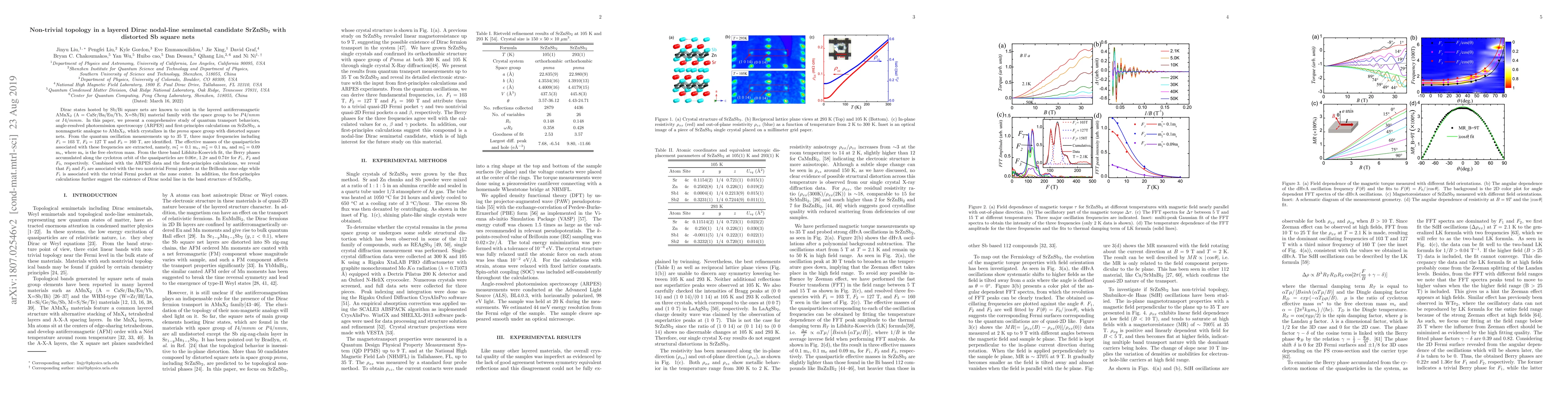 This study on SrZnSb2, a nonmagnetic material from the AMnX2 family, uses quantum oscillation measurements, ARPES, and first-principles calculations to reveal three quasiparticle frequencies (F1, F2, F3) with distinct effective masses and Berry phases. F2 and F3 are linked to nontrivial Fermi pockets at the Brillouin zone edge, while F1 is associated with a trivial pocket at the zone center. First-principles calculations suggest the presence of a Dirac nodal line in SrZnSb2's band structure.