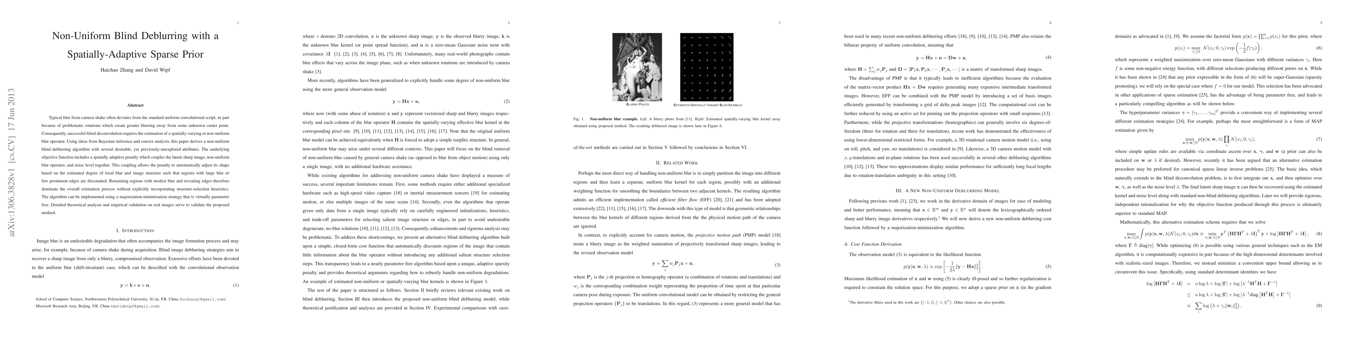 This paper proposes a non-uniform blind deblurring algorithm that estimates spatially-varying blur operators using a spatially adaptive sparse prior. The algorithm leverages Bayesian inference and convex analysis to automatically adjust the penalty based on local blur and image structure, enhancing deblurring in regions with clearer edges.