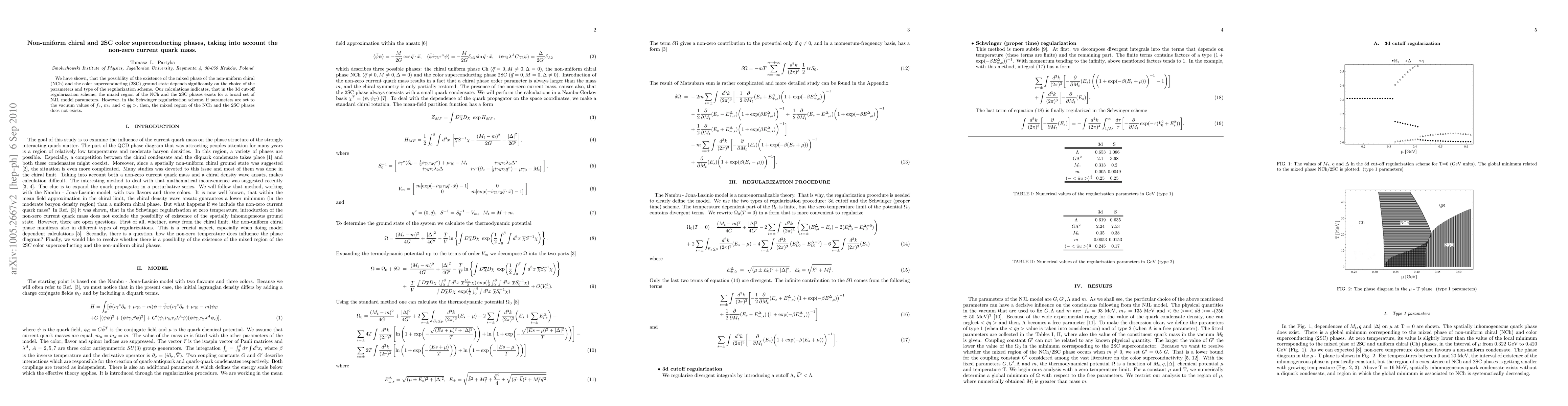 We have shown, that the possibility of the existence of the mixed phase of the non-uniform chiral (NCh) and the color superconducting (2SC) ground state depends significantly on the choice of the parameters and type of the regularization scheme. Our calculations indicates, that in the 3d cut-off regularization scheme, the mixed region of the NCh and the 2SC phases exists for a broad set of NJL model parameters. However, in the Schwinger regularization scheme, if parameters are fitted to the physical quantities in the vacuum, then, the mixed region of the NCh and the 2SC phases does not exists.