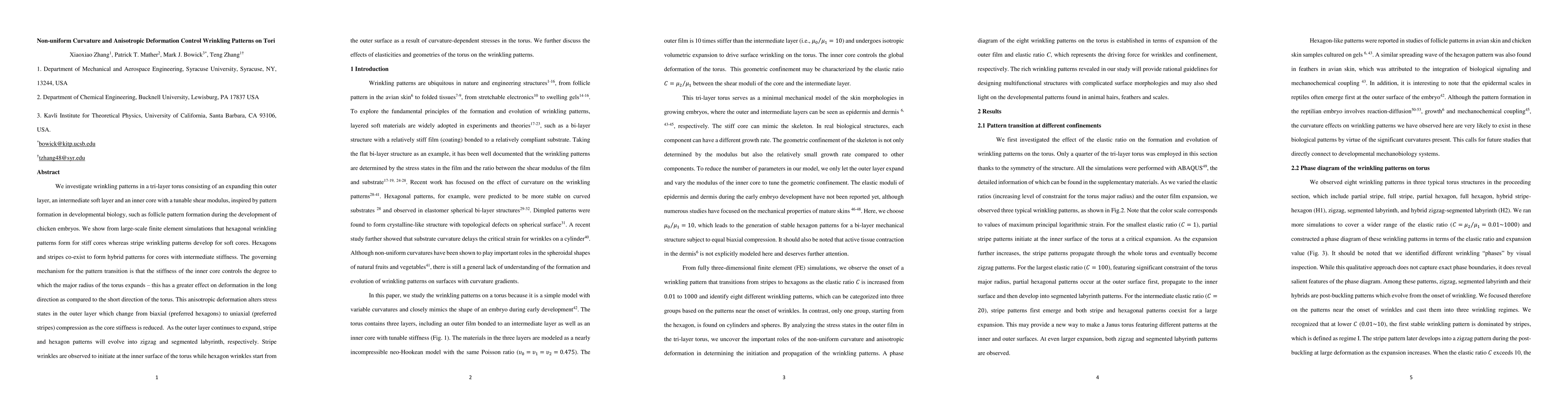 This study explores wrinkling patterns in a tri-layer torus, revealing that stiff cores induce hexagonal patterns while soft cores result in stripe patterns, with hybrid patterns forming in intermediate stiffness. The transition is governed by anisotropic deformation influenced by core stiffness affecting stress states in the outer layer.