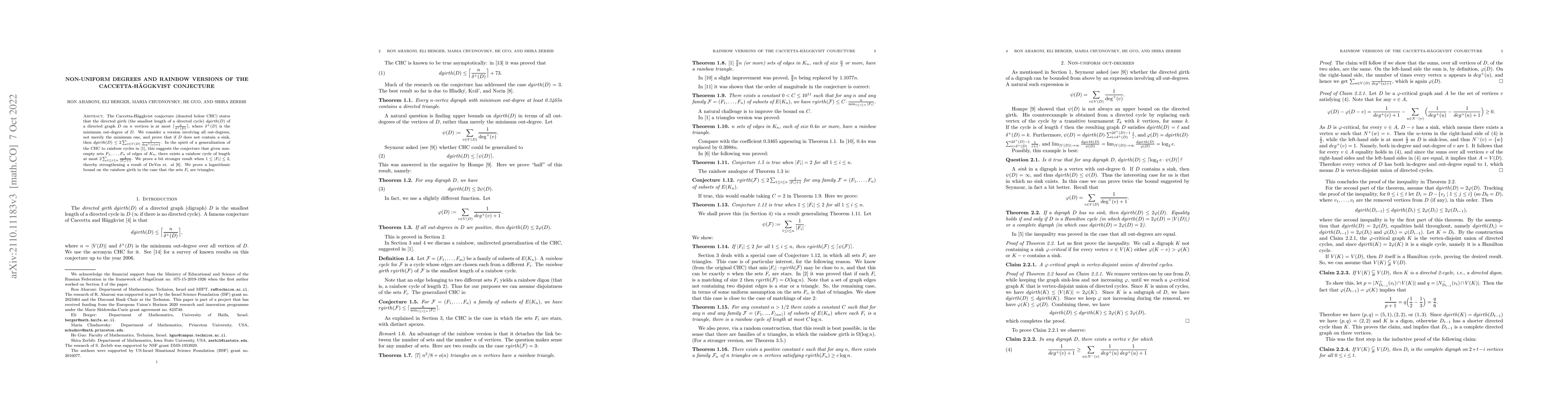 This paper explores a non-uniform version of the Caccetta-Häggkvist conjecture, proving that a directed graph without sinks has a directed girth bounded by a function of all vertex out-degrees. It also generalizes this to rainbow cycles, suggesting a conjecture about the existence of rainbow cycles in edge sets of complete graphs, and proving a stronger result for small edge sets.