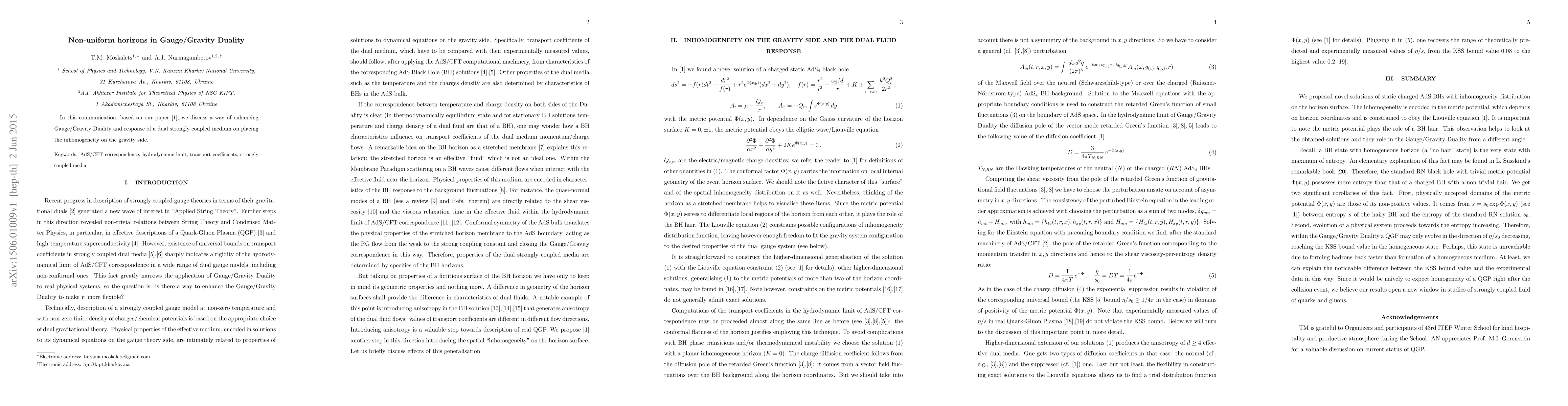 This research explores non-uniform horizons in Gauge/Gravity Duality, a phenomenon where strong gravity is equivalent to weak gauge interactions. It proposes enhancing the duality by placing inhomogeneity on the gravity side.