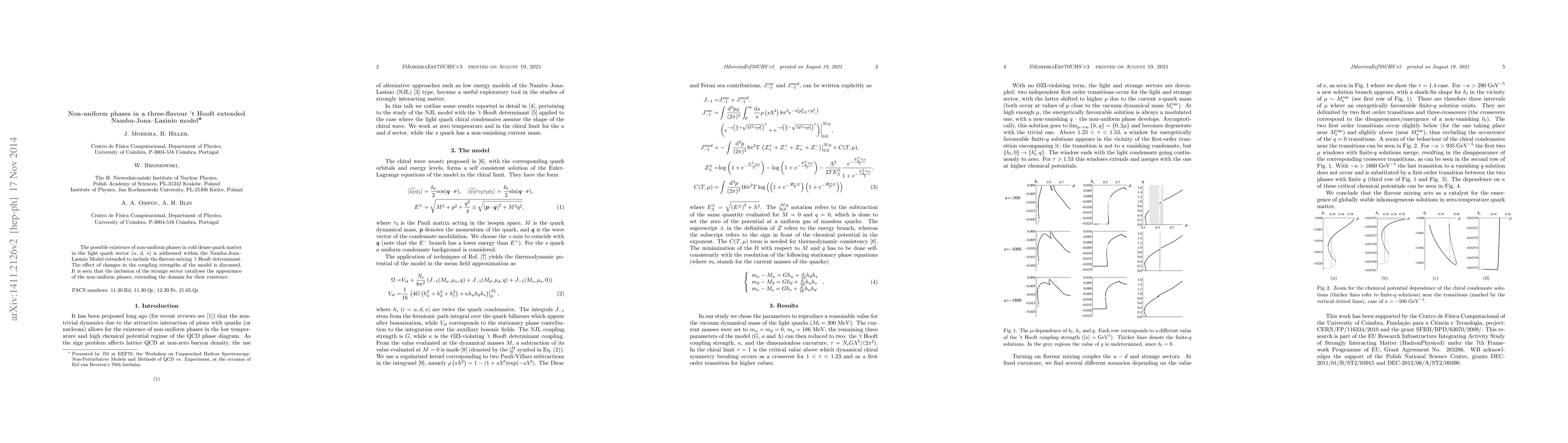The possible existence of non-uniform phases in cold dense quark matter in the light quark sector ($u$, $d$ and $s$) is addressed using the Nambu-Jona--Lasinio Model extended to include flavour-mixing 't Hooft determinant. The effect of changes in the coupling strengths of the model is discussed. It is seen that the inclusion of the strange sector catalyses the appearance of these non-uniform phases extending the domain for their appearance.