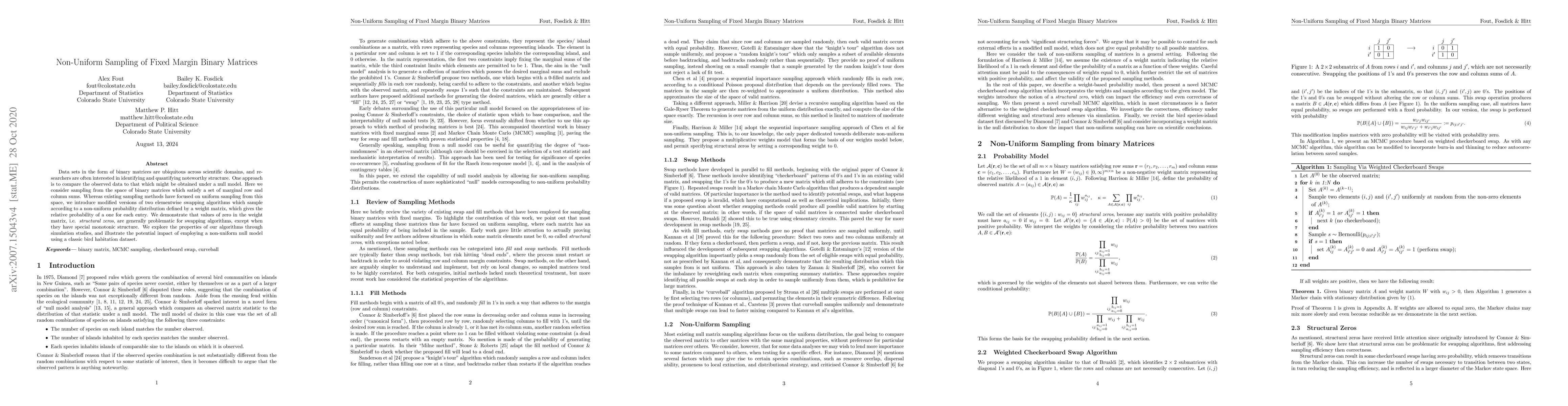 The paper presents modified elementwise swapping algorithms for non-uniform sampling of fixed margin binary matrices, incorporating a weight matrix to define relative probabilities.