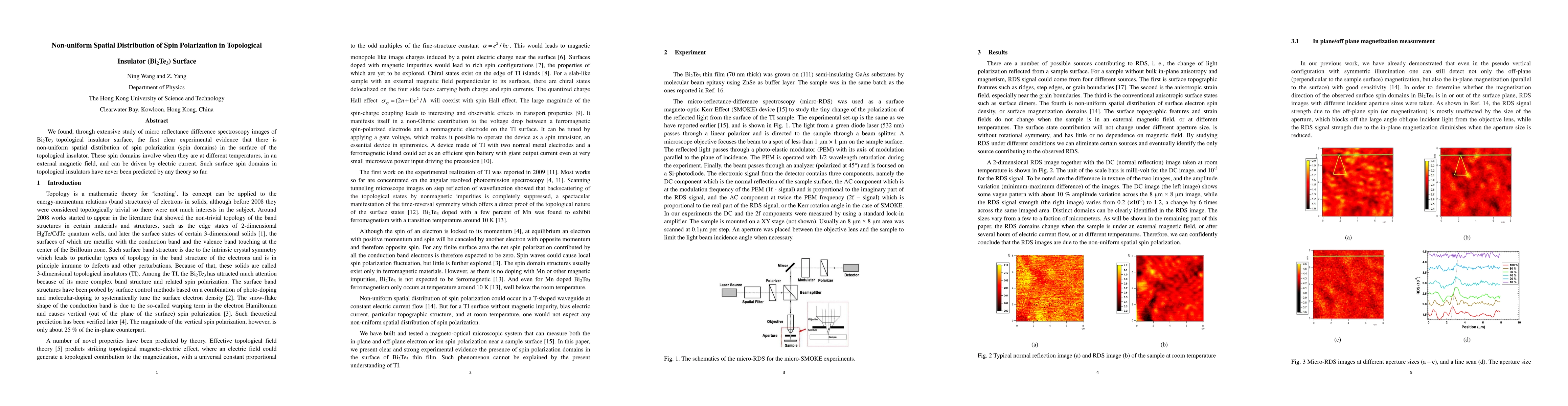 This paper presents the first experimental evidence of non-uniform spatial distribution of spin polarization (spin domains) on the surface of Bi2Te3 topological insulator, discovered through micro reflectance difference spectroscopy. These findings reveal that the spin domains are influenced by temperature, magnetic fields, and electric currents, challenging existing theoretical predictions.