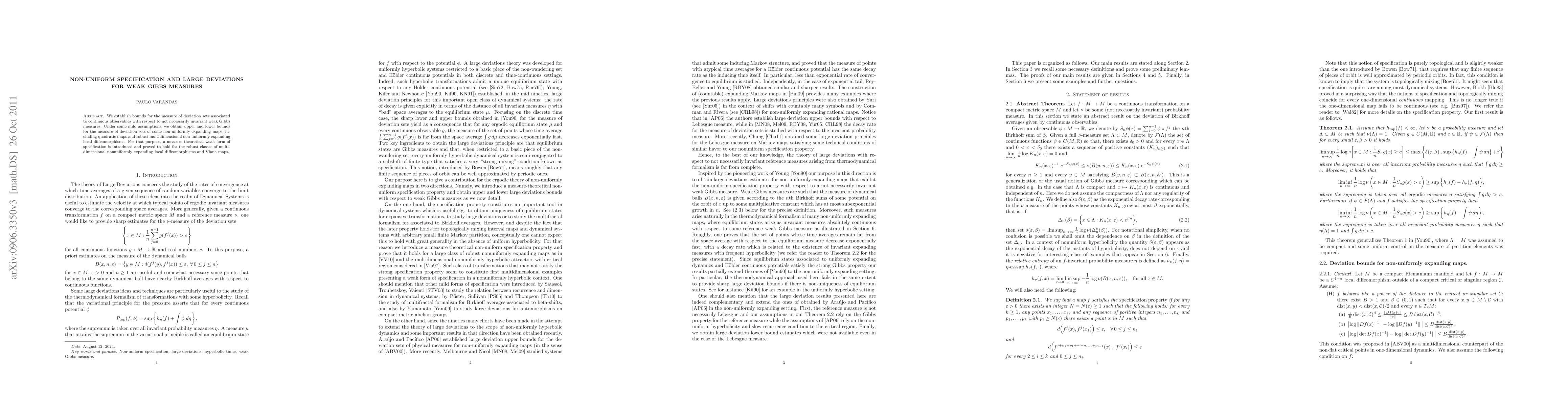 This research introduces a new measure theoretical weak form of specification for non-uniformly expanding maps, including quadratic maps and robust multidimensional non-uniformly expanding local diffeomorphisms. It provides upper and lower bounds for the measure of deviation sets associated with continuous observables under mild assumptions, demonstrating its applicability to weak Gibbs measures.