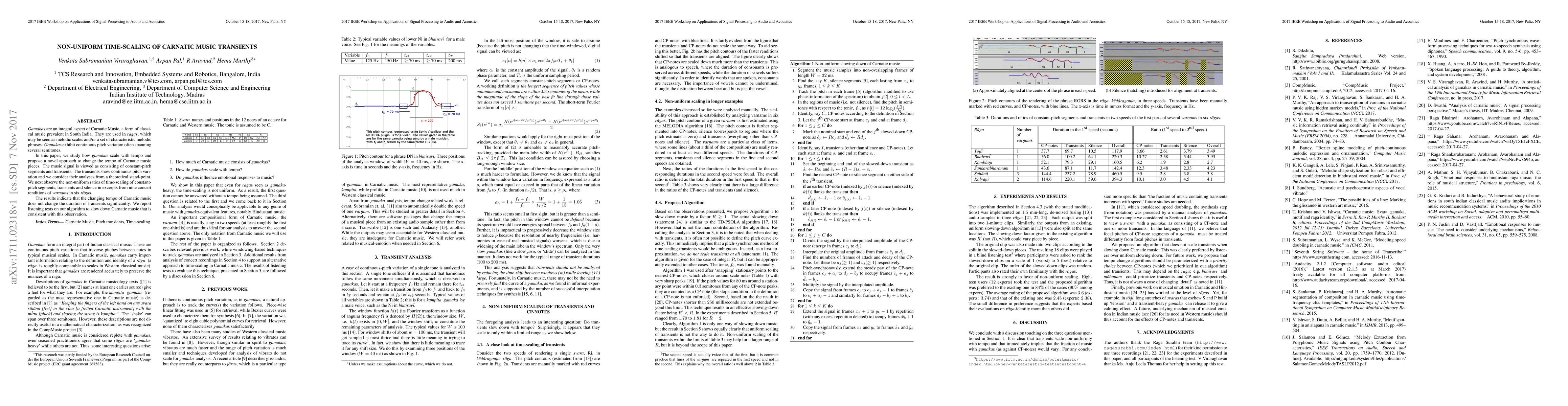This paper investigates the non-uniform time-scaling of transients in Carnatic music, focusing on gamakas, which exhibit continuous pitch variation. The study proposes a novel tempo-changing approach for Carnatic music, revealing that transients maintain their duration despite tempo changes, supported by listening tests.