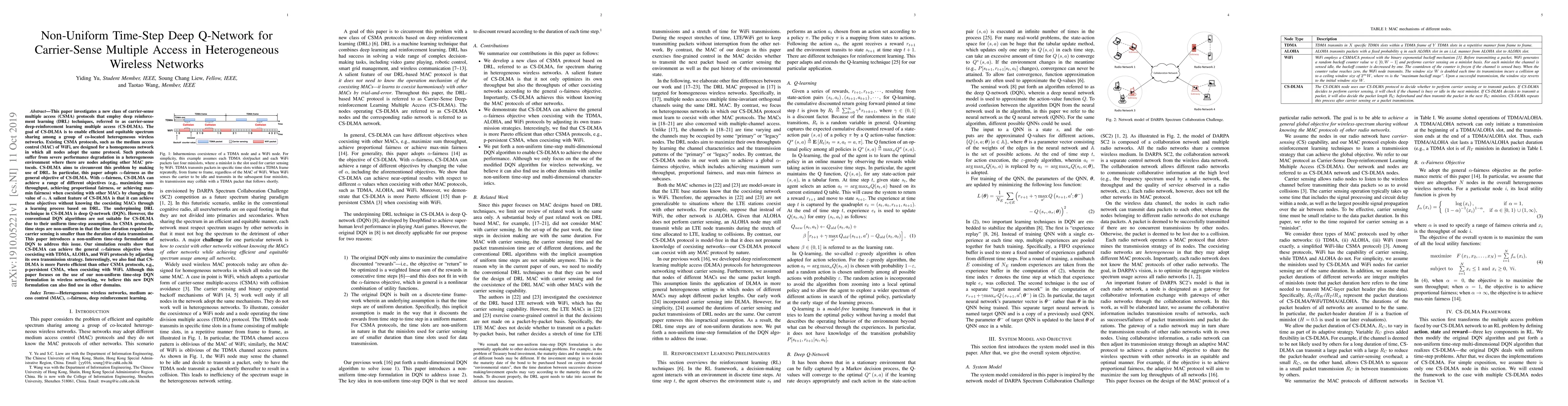 This paper proposes a carrier-sense deep-reinforcement learning multiple access (CS-DLMA) protocol using a non-uniform time-step deep Q-network to enable efficient and equitable spectrum sharing among heterogeneous wireless networks. CS-DLMA achieves alpha-fairness without prior knowledge of coexisting MAC protocols, outperforming traditional CSMA protocols in heterogeneous environments.