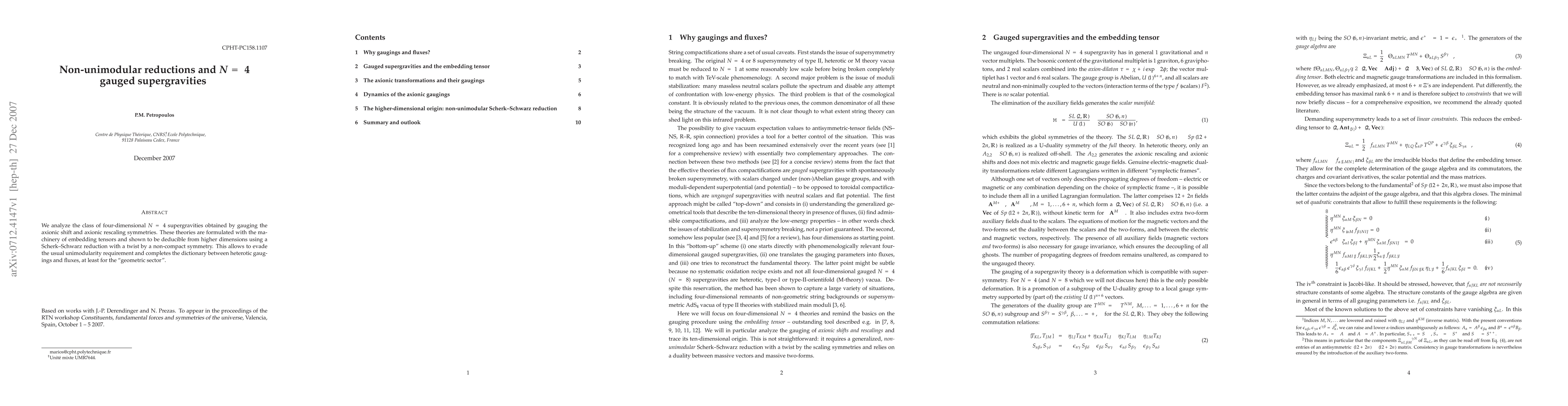 This paper explores four-dimensional N = 4 supergravities achieved by gauging axionic symmetries, employing embedding tensors and non-unimodular reductions. It demonstrates the theories' derivation from higher dimensions via Scherk-Schwarz reductions, thus bypassing the standard unimodularity requirement.