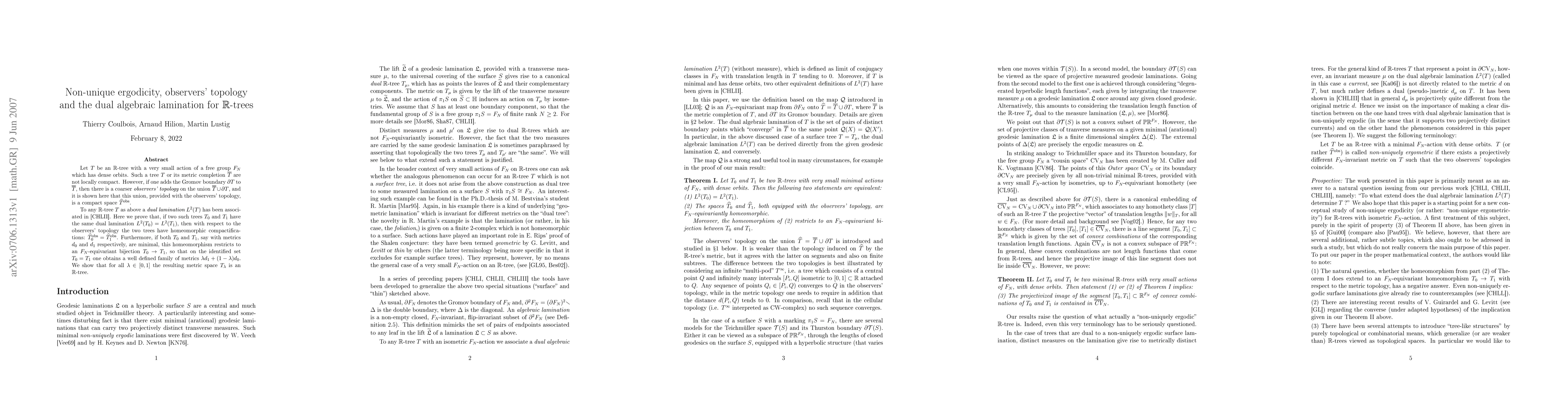 We continue in this article the study of laminations dual to very small actions of a free group F on R-trees. We prove that this lamination determines completely the combinatorial structure of the R-tree (the so-called observers' topology). On the contrary the metric is not determined by the lamination, and an R-tree may be equipped with different metrics which have the same observers' topology.