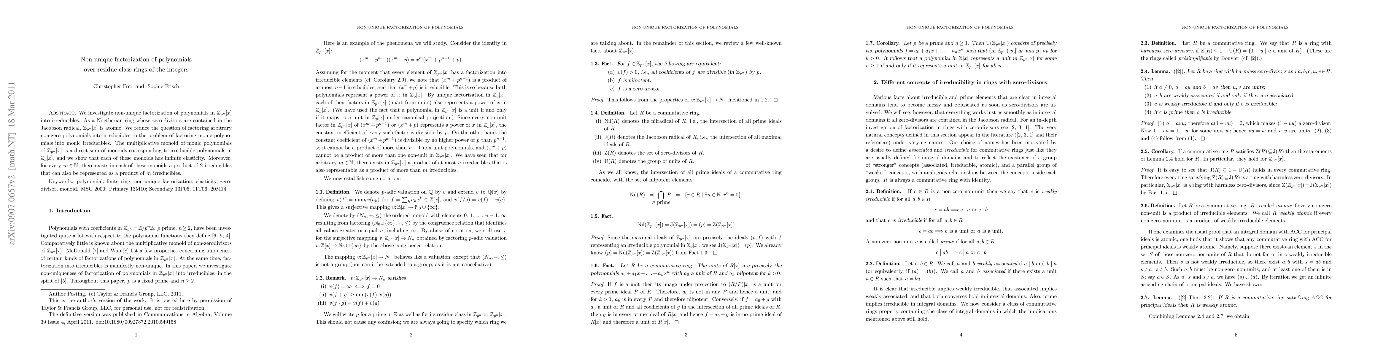 This paper explores non-unique factorization of polynomials in the residue class ring Z_{p^n}[x], demonstrating that monic irreducible polynomials exhibit infinite elasticity. It shows that every monoid of such polynomials can be represented as a product of two irreducibles, which can also be expressed as a product of any number of irreducibles.