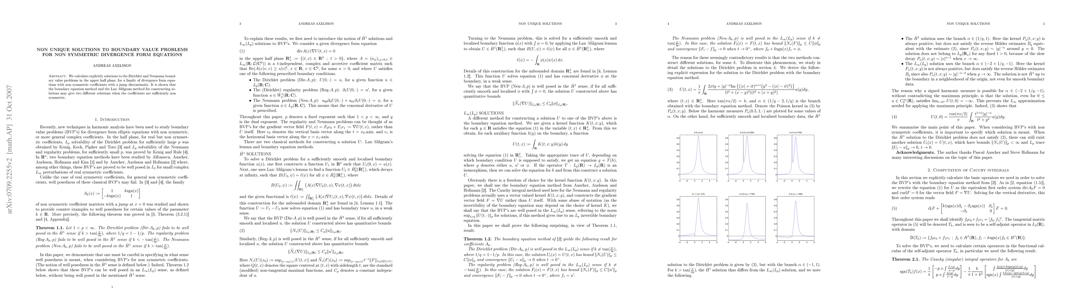 Summary: This paper investigates boundary value problems for non-symmetric divergence form equations with discontinuous coefficients, demonstrating that the boundary equation method and the Lax-Milgram method can yield distinct solutions under certain conditions. The study focuses on explicit solutions for Dirichlet and Neumann problems in the upper half plane.