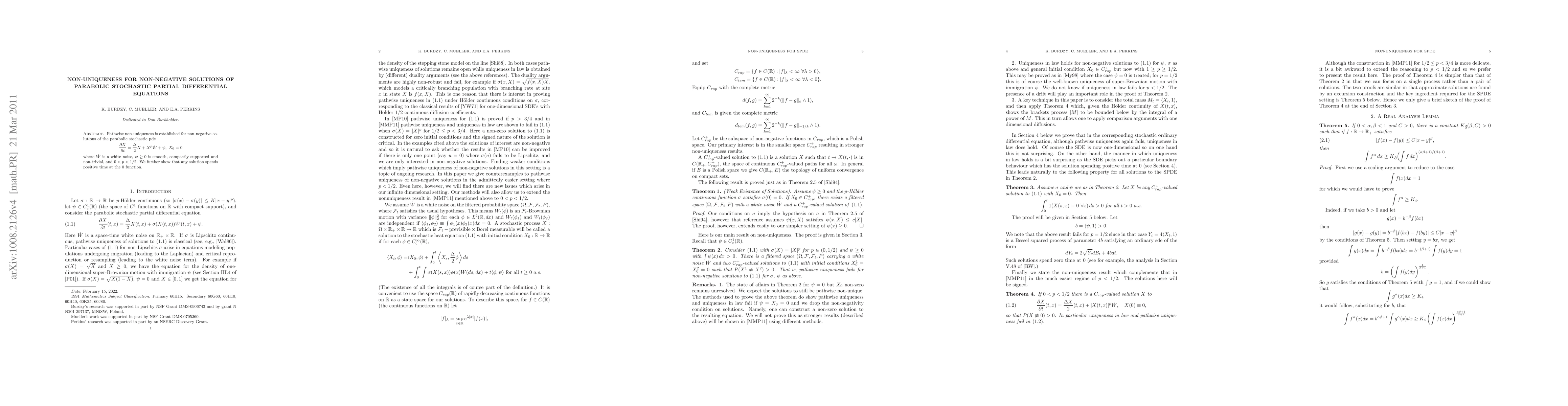 Pathwise non-uniqueness is established for non-negative solutions of the parabolic stochastic pde $$\frac{\partial X}{\partial t}=\frac{\Delta}{2}X+X^p\dot W+\psi,\ X_0\equiv 0$$ where $\dot W$ is a white noise, $\psi\ge 0$ is smooth, compactly supported and non-trivial, and $0