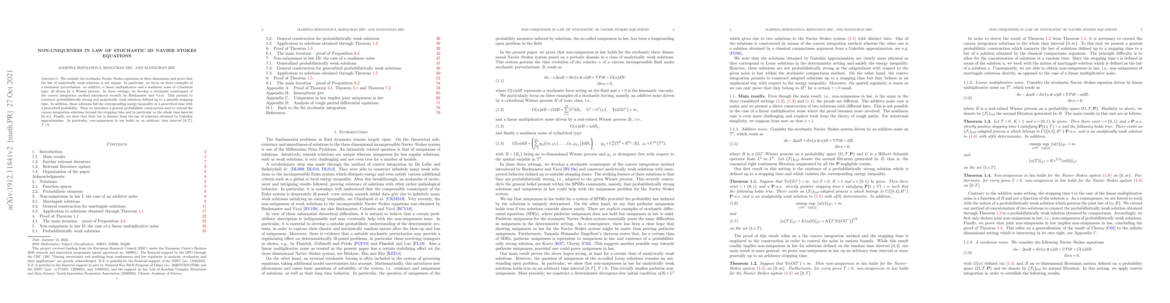 This paper demonstrates non-uniqueness in the law of stochastic 3D Navier-Stokes equations through a stochastic adaptation of convex integration method, constructing solutions that fail energy inequalities with prescribed probability. It also extends these solutions beyond stopping times to the full time interval [0,∞), showing distinct laws from Galerkin approximations, proving non-uniqueness on any interval [0,T], T>0.