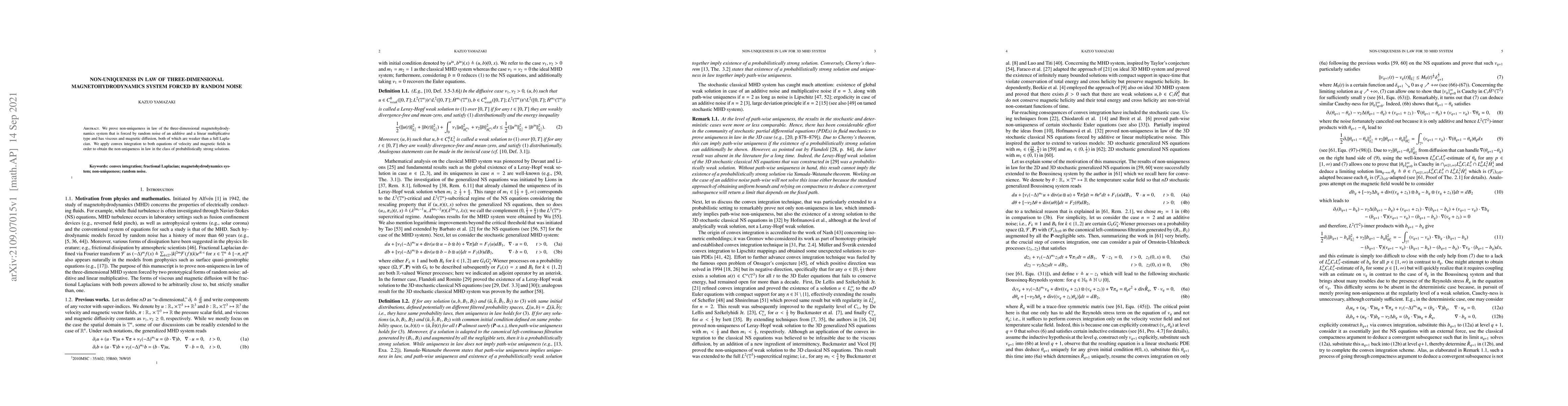 This paper demonstrates non-uniqueness in the probabilistic solutions of the three-dimensional magnetohydrodynamics system driven by random noise, utilizing convex integration techniques for both velocity and magnetic fields. The study focuses on systems with weaker than full Laplacian diffusion.