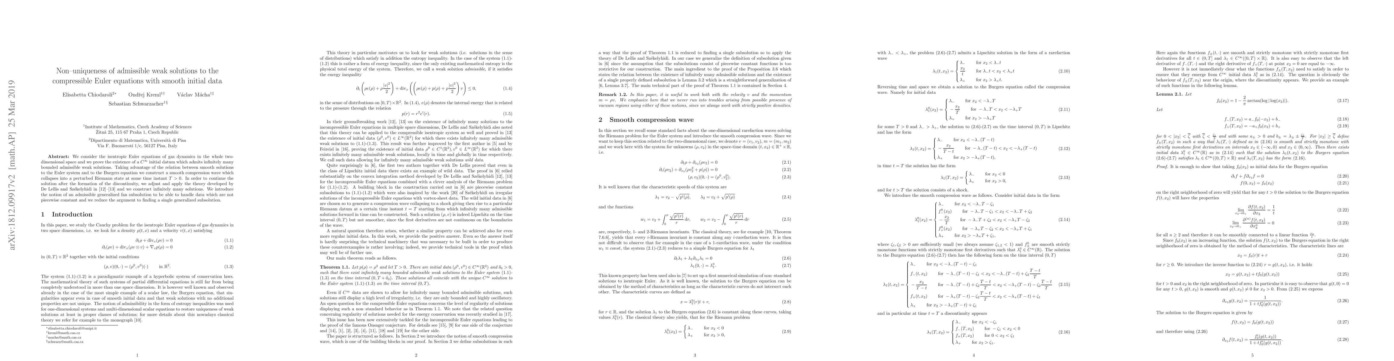 This paper demonstrates the non-uniqueness of weak solutions to the compressible Euler equations in two dimensions by constructing a smooth initial condition that admits infinitely many bounded admissible weak solutions. The authors utilize the connection between smooth solutions of the Euler system and the Burgers equation to create a smooth compression wave, and apply De Lellis and Sz\'ekelyhidi's theory to extend the solution beyond the formation of a discontinuity.