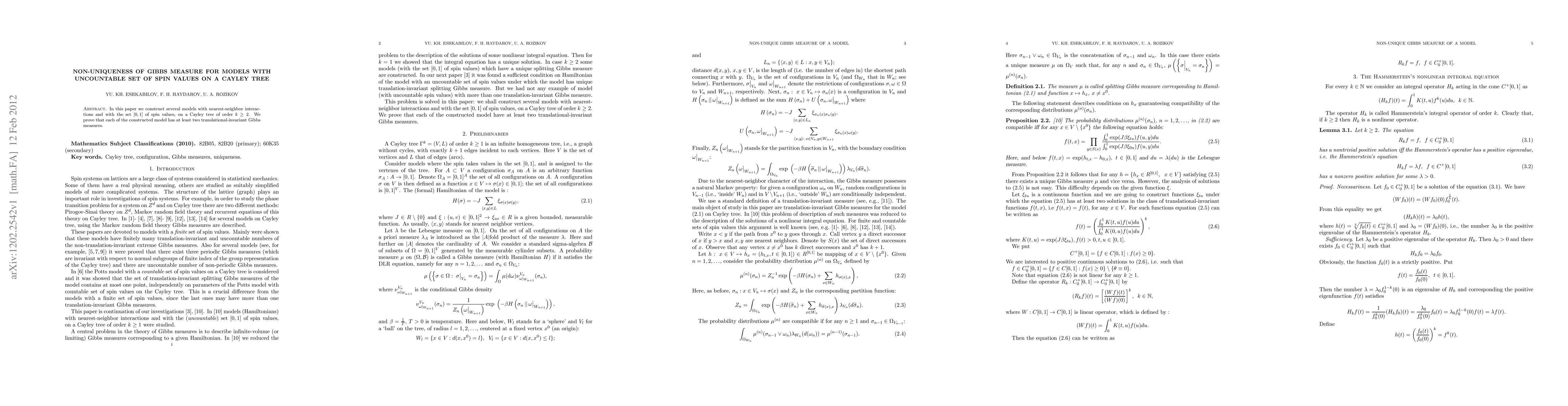 In this paper we construct several models with nearest-neighbor interactions and with the set $[0,1]$ of spin values, on a Cayley tree of order $k\geq 2$. We prove that each of the constructed model has at least two translational-invariant Gibbs measures.