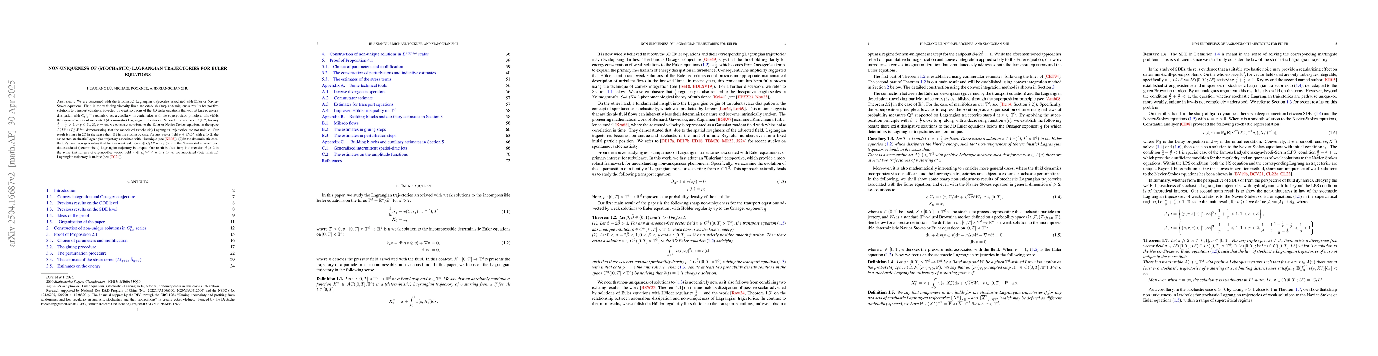 Sharp non-uniqueness results for Lagrangian trajectories associated with Euler and Navier-Stokes equations, along with construction of solutions in specific function spaces.