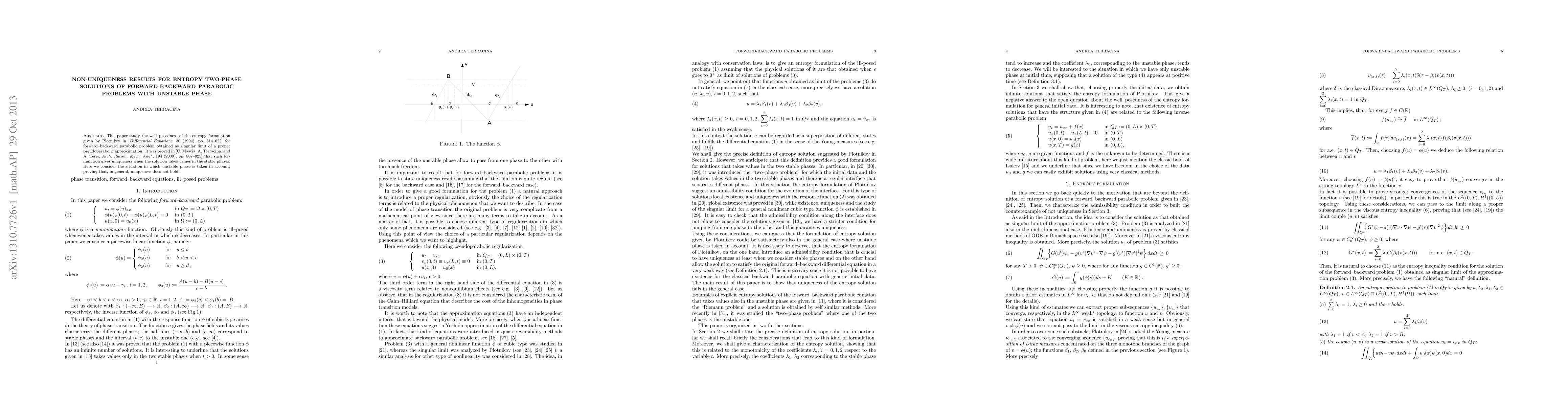 This paper study the well--posedness of the entropy formulation given by Plotnikov in [{Differential Equations}, 30 (1994), pp. 614--622] for forward-backward parabolic problem obtained as singular limit of a proper pseudoparabolic approximation. It was proved in [C. Mascia, A. Terracina, and A. Tesei, {Arch.\ Ration.\ Mech.\ Anal.}, 194 (2009), pp. 887--925] that such formulation gives uniqueness when the solution takes values in the stable phases. Here we consider the situation in which unstable phase is taken in account, proving that, in general, uniqueness does not hold.