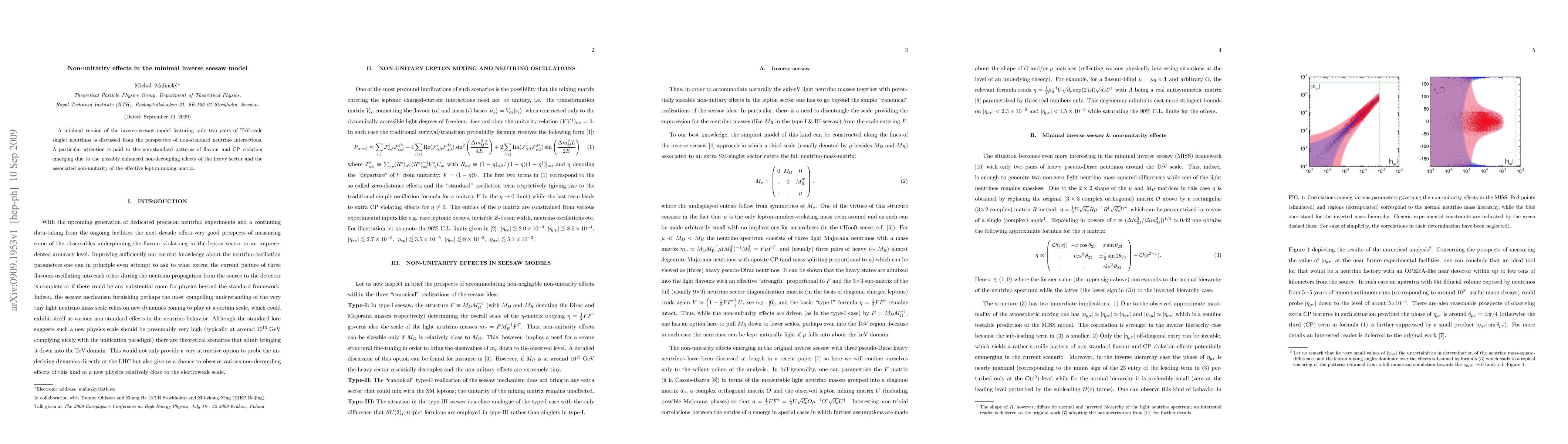 This paper explores the minimal inverse seesaw model with two pairs of TeV-scale singlet neutrinos, focusing on non-standard neutrino interactions and the resulting enhanced non-unitarity effects in the effective lepton mixing matrix, which lead to unique patterns of flavor and CP violation.