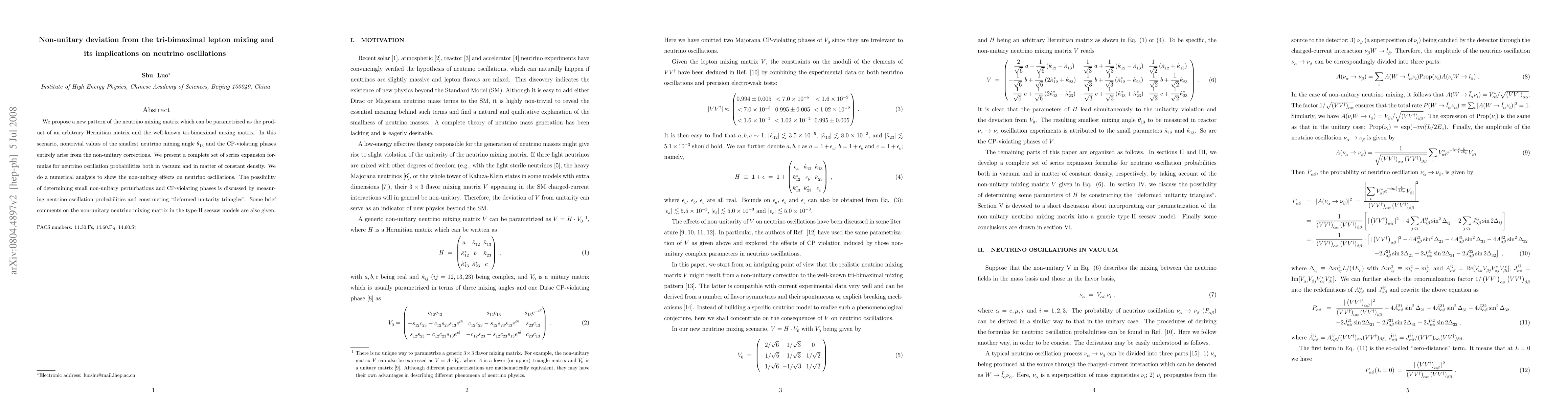 This paper proposes a new neutrino mixing matrix derived from the tri-bimaximal model through non-unitary corrections, leading to non-zero \theta_13 and CP-violating phases. It provides series expansions for oscillation probabilities and discusses the implications for measuring these effects and determining small perturbations.