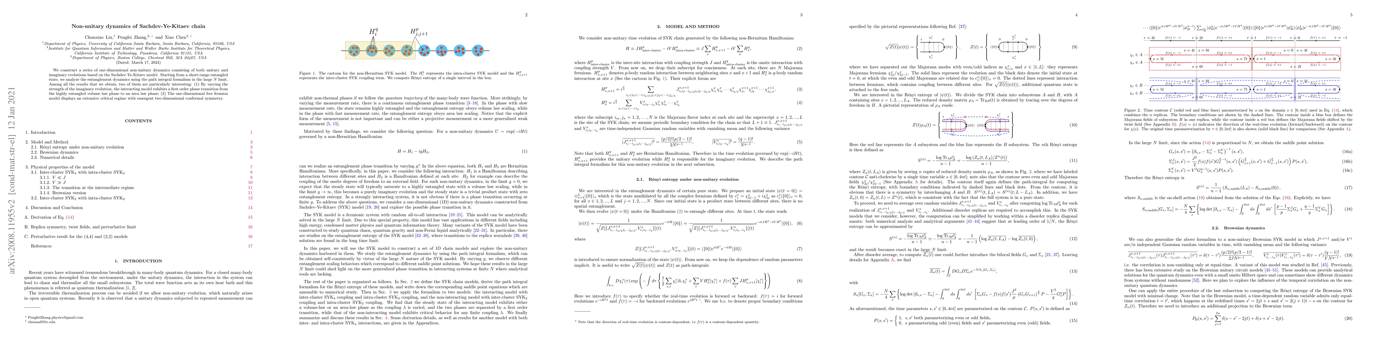 This paper constructs non-unitary dynamics in the Sachdev-Ye-Kitaev model, revealing a phase transition from volume law to area law entanglement by varying imaginary evolution strength. Additionally, the one-dimensional free fermion model shows an extensive critical regime with emergent two-dimensional conformal symmetry.