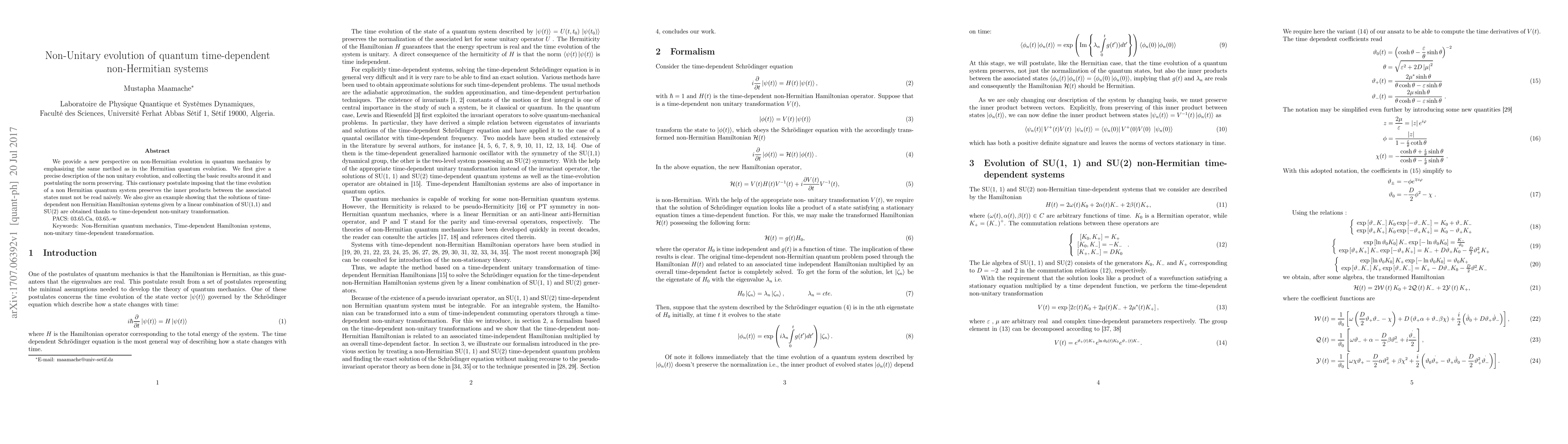 This paper explores non-unitary evolution in quantum mechanics for non-Hermitian systems, emphasizing the preservation of inner products during time evolution. It demonstrates that solutions for time-dependent non-Hermitian Hamiltonians can be derived through time-dependent non-unitary transformations, using SU(1,1) and SU(2) groups.