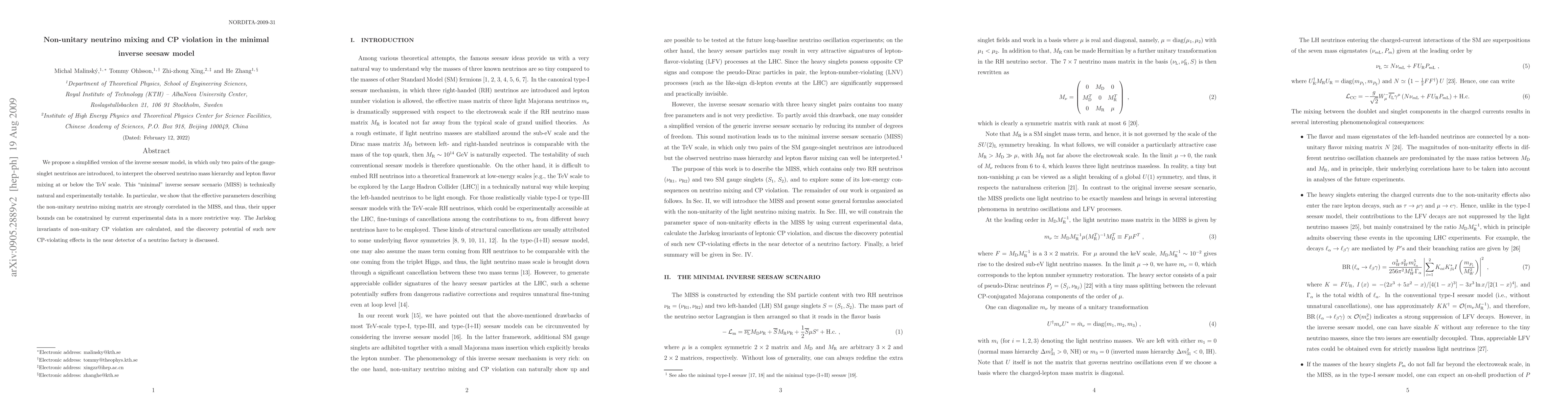 This paper proposes a simplified minimal inverse seesaw model (MISS) to explain neutrino mass hierarchy and mixing, demonstrating strong correlations in non-unitary mixing parameters and exploring CP violation through Jarlskog invariants, with implications for future neutrino detector experiments.