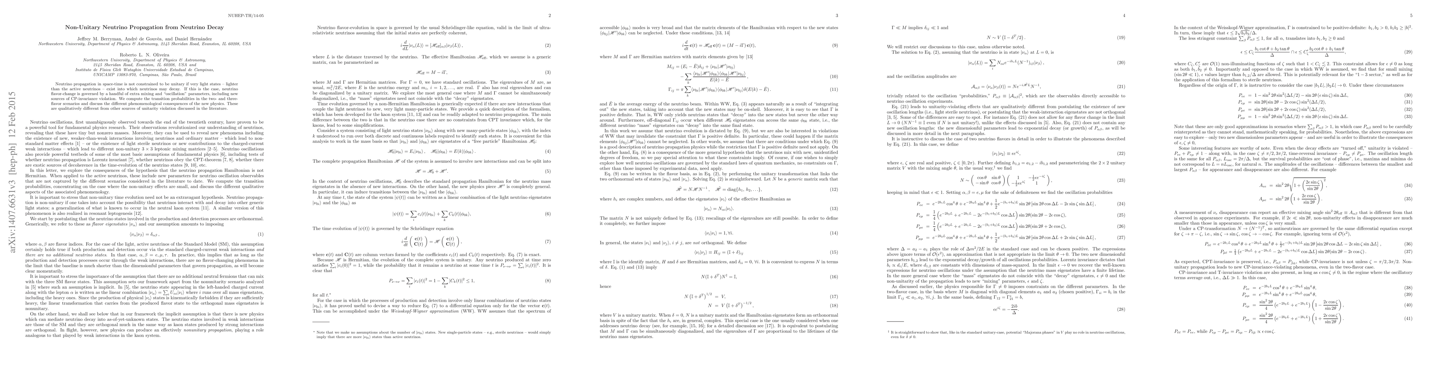 Neutrino propagation in space-time is not constrained to be unitary if very light states - lighter than the active neutrinos - exist into which neutrinos may decay. If this is the case, neutrino flavor-change is governed by a handful of extra mixing and "oscillation" parameters, including new sources of CP-invariance violation. We compute the transition probabilities in the two- and three-flavor scenarios and discuss the different phenomenological consequences of the new physics. These are qualitatively different from other sources of unitarity violation discussed in the literature.