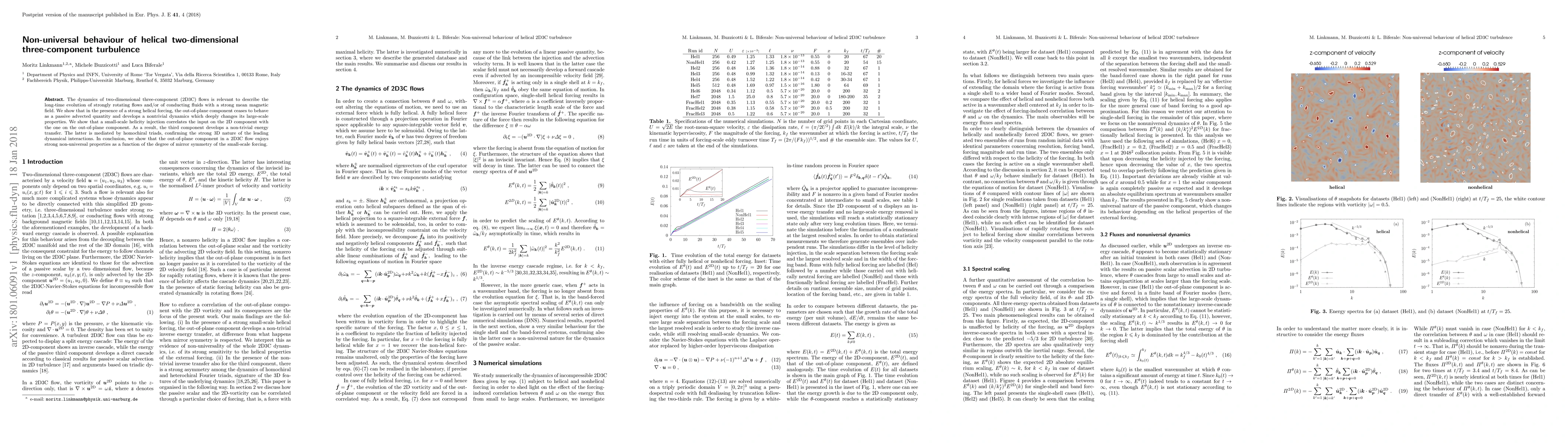 This research demonstrates that in strongly rotating or magnetized 2D fluids, a third out-of-plane component, under strong helical forcing, develops nontrivial dynamics, altering large-scale properties. The energy transfer is mediated by homochiral triads, highlighting non-universal behavior based on the mirror symmetry of small-scale forcing.
