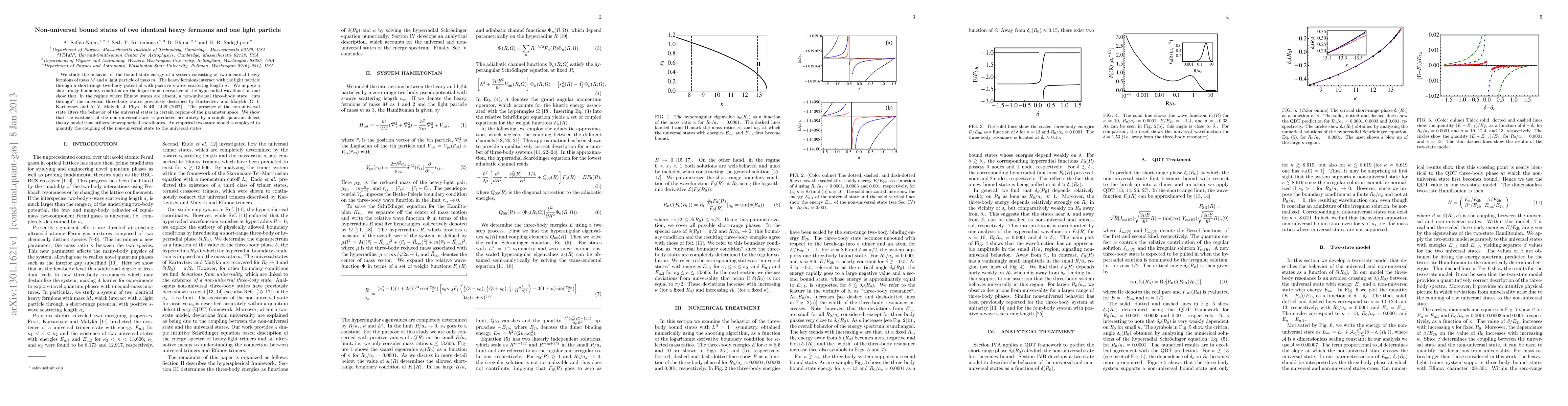 We study the behavior of the bound state energy of a system consisting of two identical heavy fermions of mass M and a light particle of mass m. The heavy fermions interact with the light particle through a short-range two-body potential with positive s-wave scattering length a_s. We impose a short-range boundary condition on the logarithmic derivative of the hyperradial wavefunction and show that, in the regime where Efimov states are absent, a non-universal three-body state "cuts through" the universal three-body states previously described by Kartavtsev and Malykh [O. I. Kartavtsev and A. V. Malykh, J. Phys. B 40, 1429 (2007)]. The presence of the non-universal state alters the behavior of the universal states in certain regions of the parameter space. We show that the existence of the non-universal state is predicted accurately by a simple quantum defect theory model that utilizes hyperspherical coordinates. An empirical two-state model is employed to quantify the coupling of the non-universal state to the universal states.