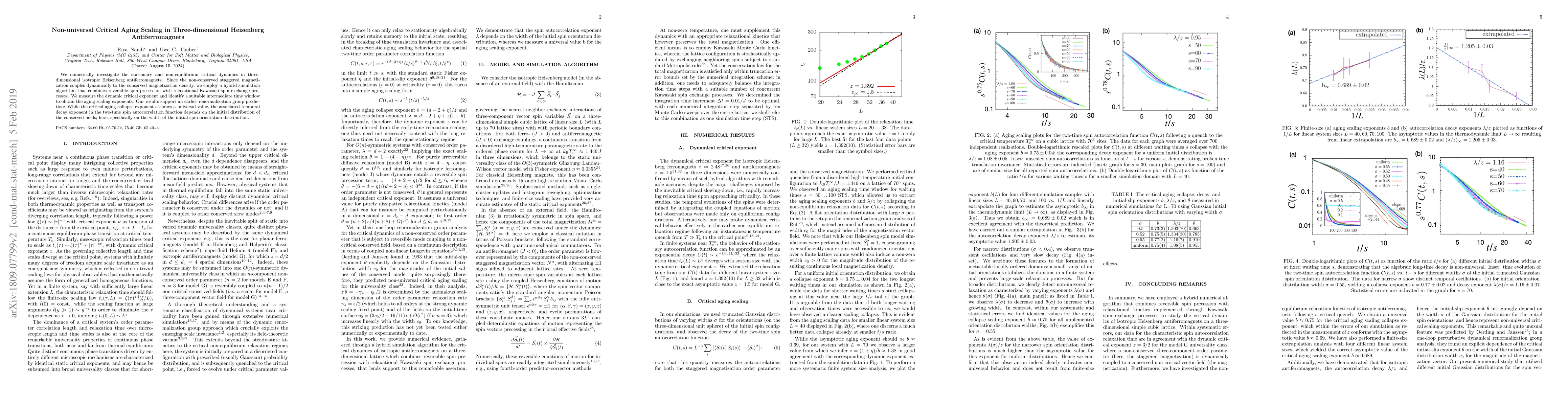 We numerically investigate the stationary and non-equilibrium critical dynamics in three-dimensional isotropic Heisenberg antiferromagnets. Since the non-conserved staggered magnetization couples dynamically to the conserved magnetization density, we employ a hybrid simulation algorithm that combines reversible spin precession with relaxational Kawasaki spin exchange processes. We measure the dynamic critical exponent and identify a suitable intermediate time window to obtain the aging scaling exponents. Our results support an earlier renormalization group prediction: While the critical aging collapse exponent assumes a universal value, the associated temporal decay exponent in the two-time spin autocorrelation function depends on the initial distribution of the conserved fields; here, specifically on the width of the initial spin orientation distribution.