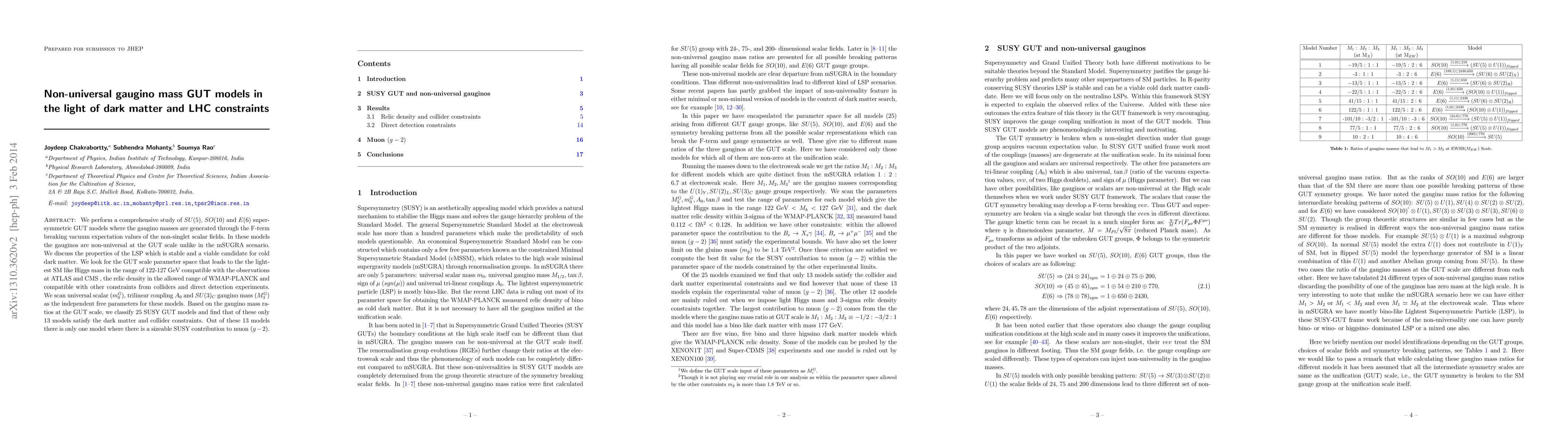 This paper investigates non-universal gaugino mass models in $SU(5)$, $SO(10)$, and $E(6)$ supersymmetric GUT frameworks, focusing on viable dark matter candidates and compatibility with LHC constraints. Only 13 out of 25 models meet dark matter and collider constraints, with one model showing a significant SUSY contribution to muon $(g-2)$.
