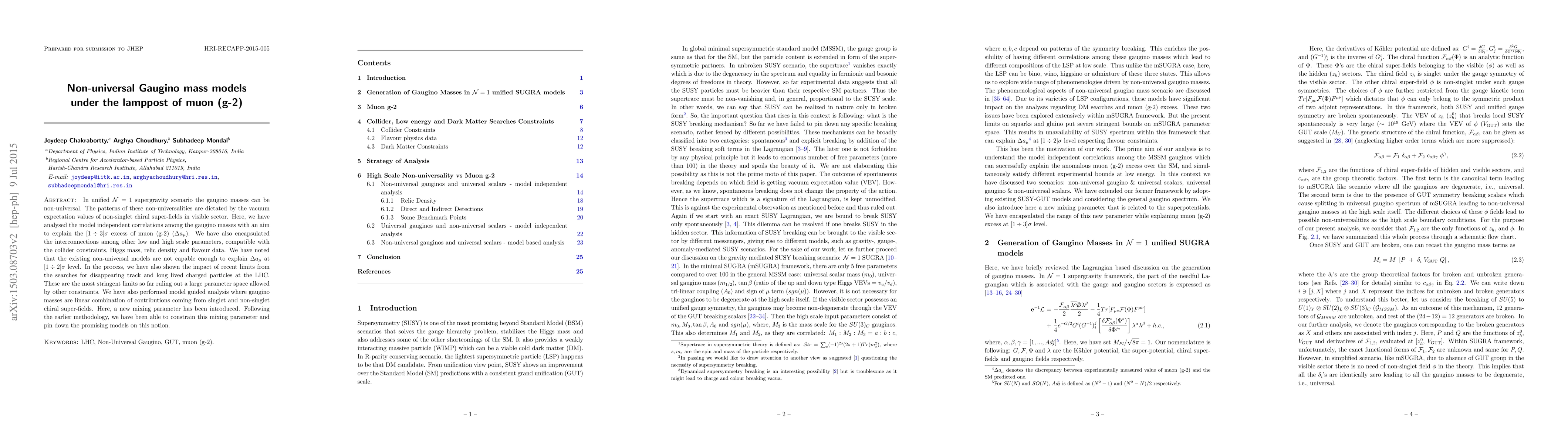 In unified $\mathcal{N}=1$ supergravity scenario the gaugino masses can be non-universal. The patterns of these non-universalities are dictated by the vacuum expectation values of non-singlet chiral super-fields in visible sector. Here, we have analysed the model independent correlations among the gaugino masses with an aim to explain the $[1\div 3]\sigma$ excess of muon (g-2) ($\Delta a_\mu$). We have also encapsulated the interconnections among other low and high scale parameters, compatible with the collider constraints, Higgs mass, relic density and flavour data. We have noted that the existing non-universal models are not capable enough to explain $\Delta a_\mu$ at $[1\div 2]\sigma$ level. In the process, we have also shown the impact of recent limits from the searches for disappearing track and long lived charged particles at the LHC. These are the most stringent limits so far ruling out a large parameter space allowed by other constraints. We have also performed model guided analysis where gaugino masses are linear combination of contributions coming from singlet and non-singlet chiral super-fields. Here, a new mixing parameter has been introduced. Following the earlier methodology, we have been able to constrain this mixing parameter and pin down the promising models on this notion.
