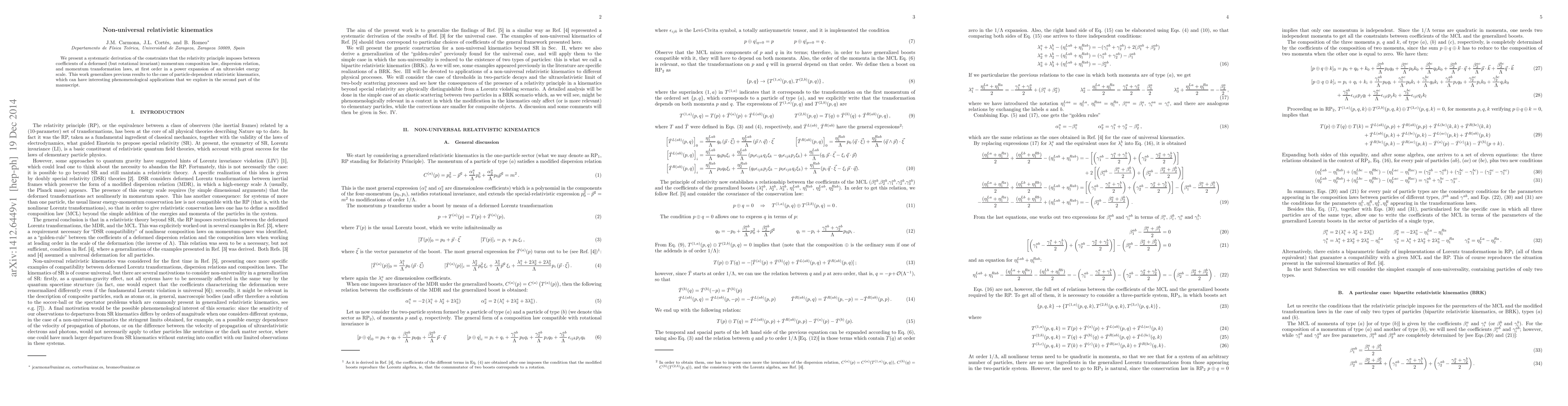 This paper systematically derives the constraints imposed by the relativity principle on a deformed relativistic kinematics framework, focusing on particle-dependent momentum composition, dispersion relations, and transformation laws. It explores potential phenomenological applications of this generalized non-universal relativistic kinematics.