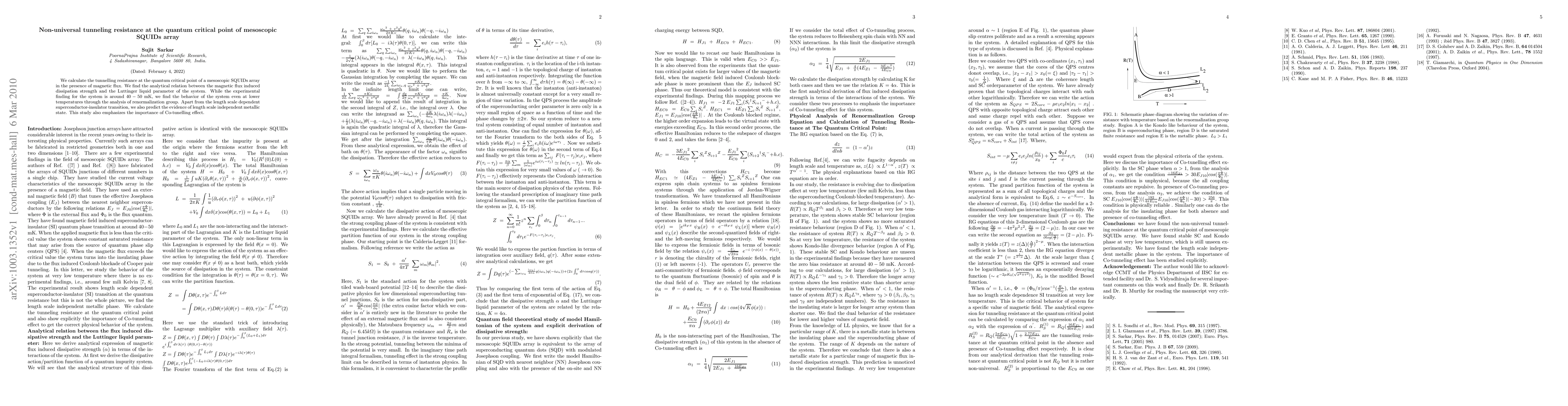 This research investigates the tunneling resistance at the quantum critical point in a mesoscopic SQUIDs array, revealing an analytical relation between magnetic flux-induced dissipation and the Luttinger liquid parameter. The study predicts a superconductor-insulator transition and a length scale independent metallic state, highlighting the significance of the Co-tunneling effect.