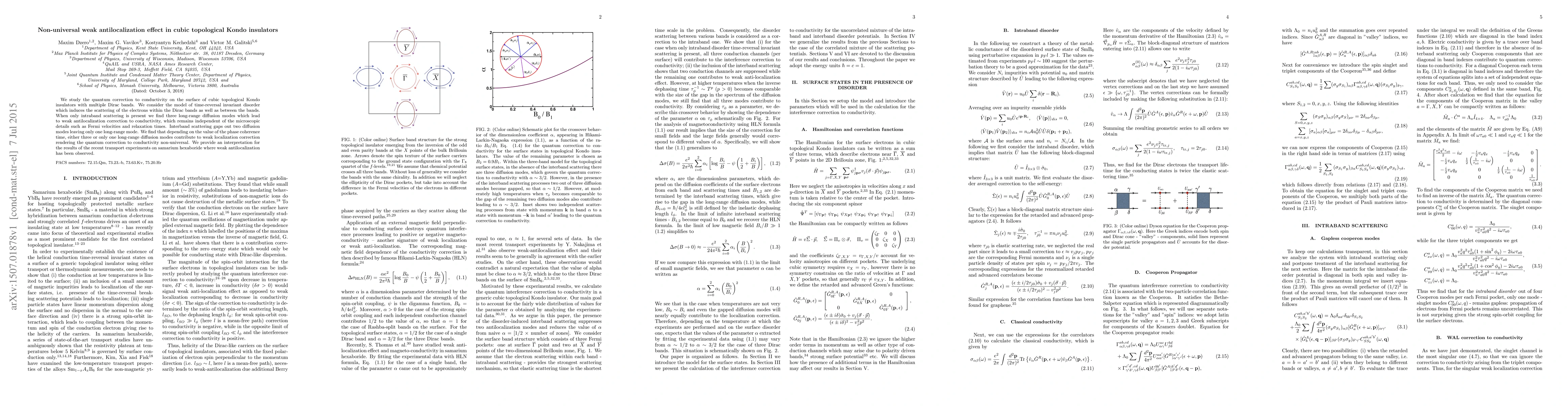 This paper investigates the quantum correction to conductivity in cubic topological Kondo insulators, revealing that weak antilocalization effects depend on the presence of intraband versus interband scattering, leading to non-universal weak antilocalization due to varying phase coherence times. The findings explain recent transport experiments on samarium hexaboride.