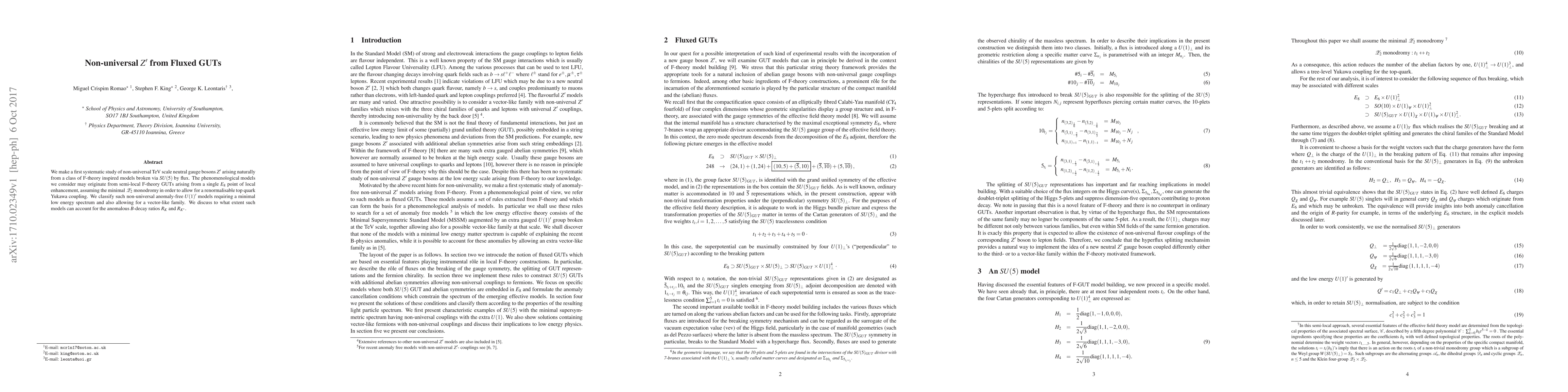 We make a first systematic study of non-universal TeV scale neutral gauge bosons $Z'$ arising naturally from a class of F-theory inspired models broken via $SU(5)$ by flux. The phenomenological models we consider may originate from semi-local F-theory GUTs arising from a single $E_8$ point of local enhancement, assuming the minimal ${\cal Z}_2$ monodromy in order to allow for a renormalisable top quark Yukawa coupling. We classify such non-universal anomaly-free $U(1)'$ models requiring a minimal low energy spectrum and also allowing for a vector-like family. We discuss to what extent such models can account for the anomalous $B$-decay ratios $R_{K}$ and $R_{K^*}$.