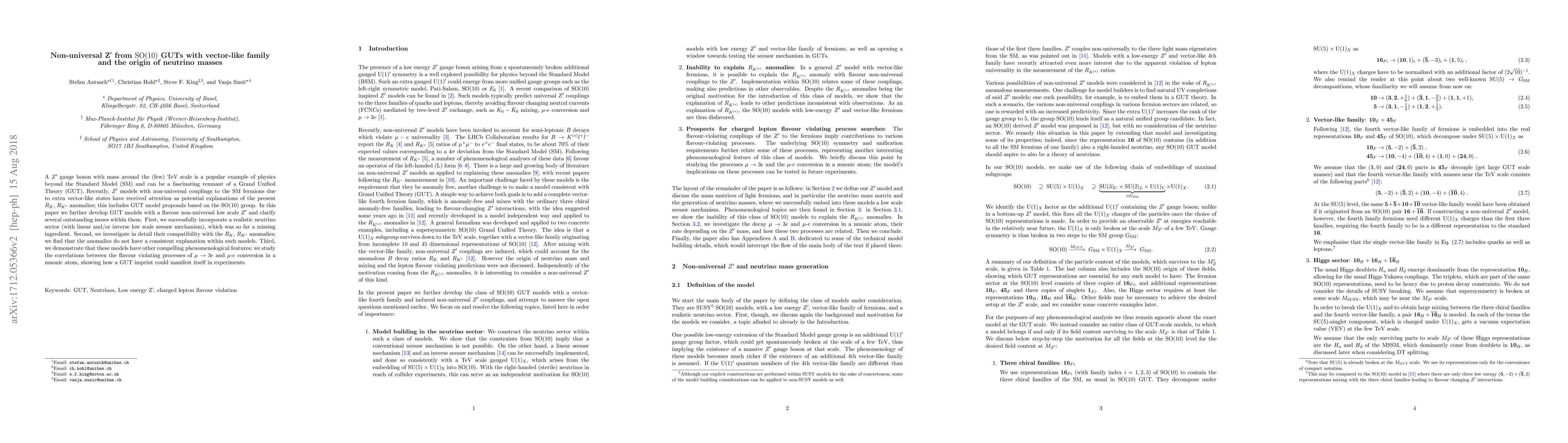 Research paper explores non-universal Z' gauge boson models from SO(10) GUTs with vector-like family states, proposing new explanations for R_K and R_{K*} anomalies and potential manifestations in muon conversion experiments.