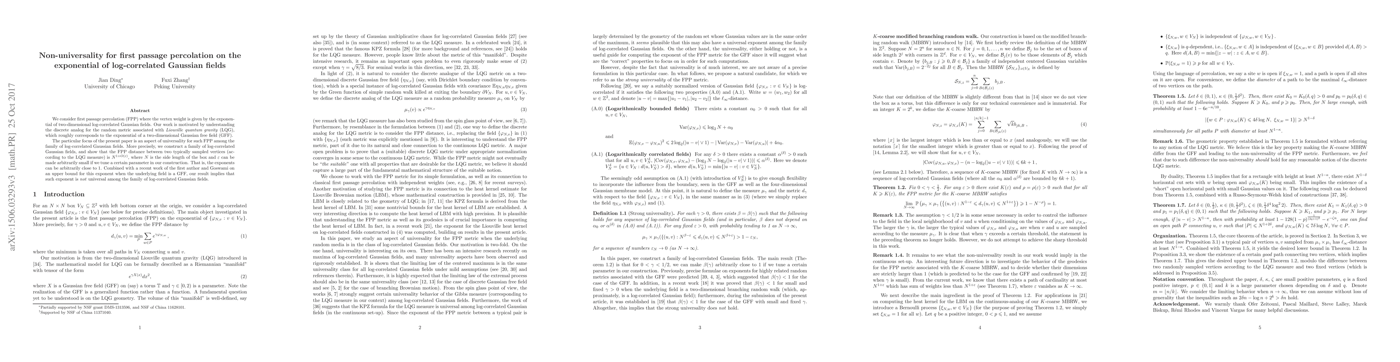 We consider first passage percolation (FPP) where the vertex weight is given by the exponential of two-dimensional log-correlated Gaussian fields. Our work is motivated by understanding the discrete analog for the random metric associated with \emph{Liouville quantum gravity} (LQG), which roughly corresponds to the exponential of a two-dimensional Gaussian free field (GFF). The particular focus of the present paper is an aspect of universality for such FPP among the family of log-correlated Gaussian fields. More precisely, we construct a family of log-correlated Gaussian fields, and show that the FPP distance between two typically sampled vertices (according to the LQG measure) is $N^{1+ O(\epsilon)}$, where $N$ is the side length of the box and $\epsilon$ can be made arbitrarily small if we tune a certain parameter in our construction. That is, the exponents can be arbitrarily close to $1$. Combined with a recent work of the first author and Goswami on an upper bound for this exponent when the underlying field is a GFF, our result implies that such exponent is \emph{not} universal among the family of log-correlated Gaussian fields.