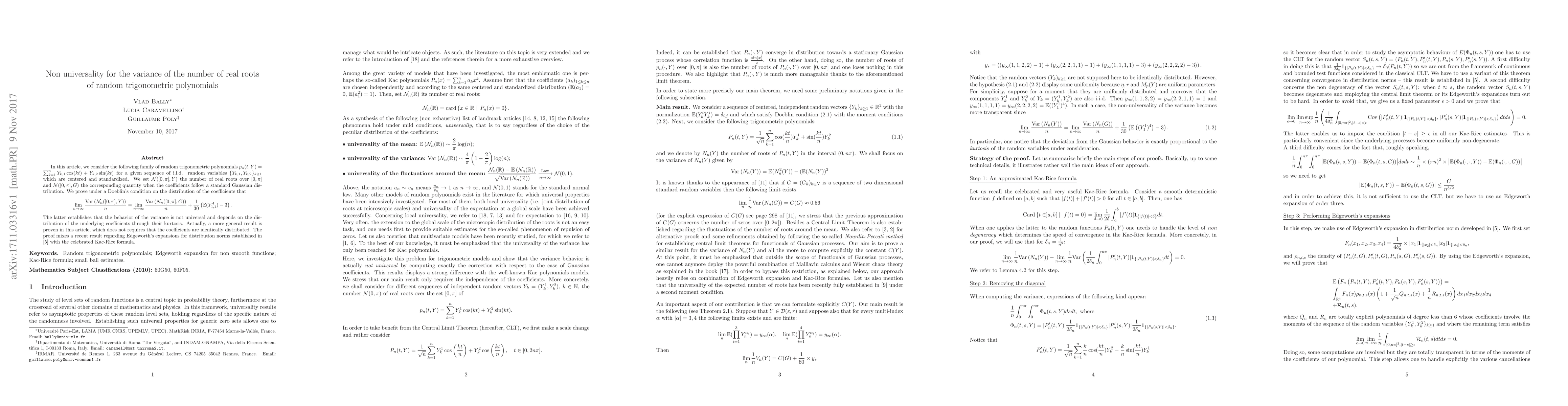 In this article, we consider the following family of random trigonometric polynomials $p_n(t,Y)=\sum_{k=1}^n Y_{k,1} \cos(kt)+Y_{k,2}\sin(kt)$ for a given sequence of i.i.d. random variables $\{Y_{k,1},Y_{k,2}\}_{k\ge 1}$ which are centered and standardized. We set $\mathcal{N}([0,\pi],Y)$ the number of real roots over $[0,\pi]$ and $\mathcal{N}([0,\pi],G)$ the corresponding quantity when the coefficients follow a standard Gaussian distribution. We prove under a Doeblin's condition on the distribution of the coefficients that $$ \lim_{n\to\infty}\frac{\text{Var}\left(\mathcal{N}_n([0,\pi],Y)\right)}{n} =\lim_{n\to\infty}\frac{\text{Var}\left(\mathcal{N}_n([0,\pi],G)\right)}{n} +\frac{1}{30}\left(\mathbb{E}(Y_{1,1}^4)-3\right). $$ The latter establishes that the behavior of the variance is not universal and depends on the distribution of the underlying coefficients through their kurtosis. Actually, a more general result is proven in this article, which does not require that the coefficients are identically distributed. The proof mixes a recent result regarding Edgeworth's expansions for distribution norms established in arXiv:1606.01629 with the celebrated Kac-Rice formula.