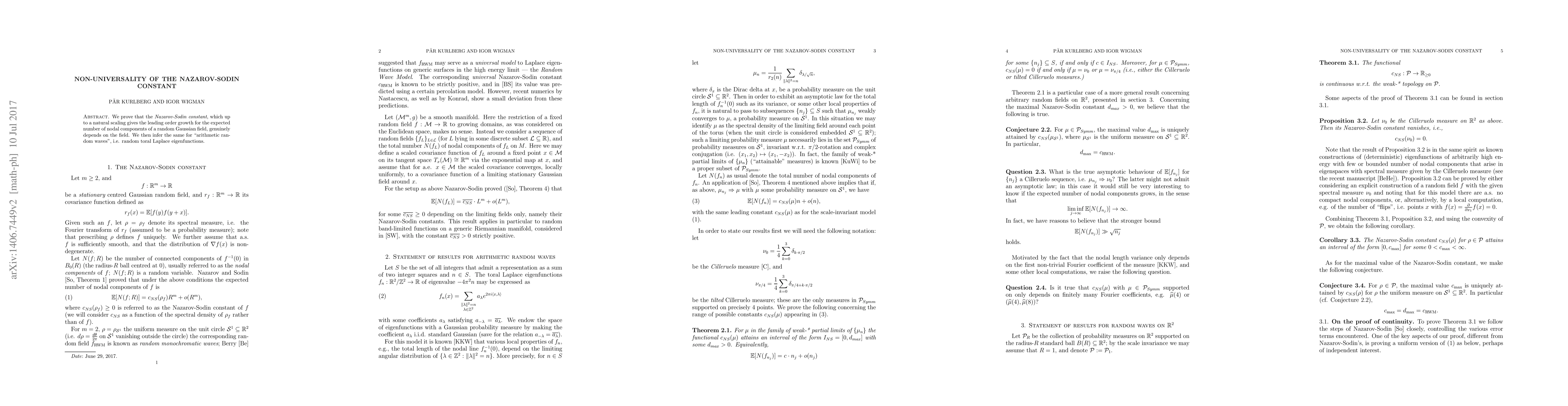 Summary: The study demonstrates that the Nazarov-Sodin constant, previously thought to be universal, varies with the specific Gaussian field, and this non-universality extends to "arithmetic random waves" such as random toral Laplace eigenfunctions.