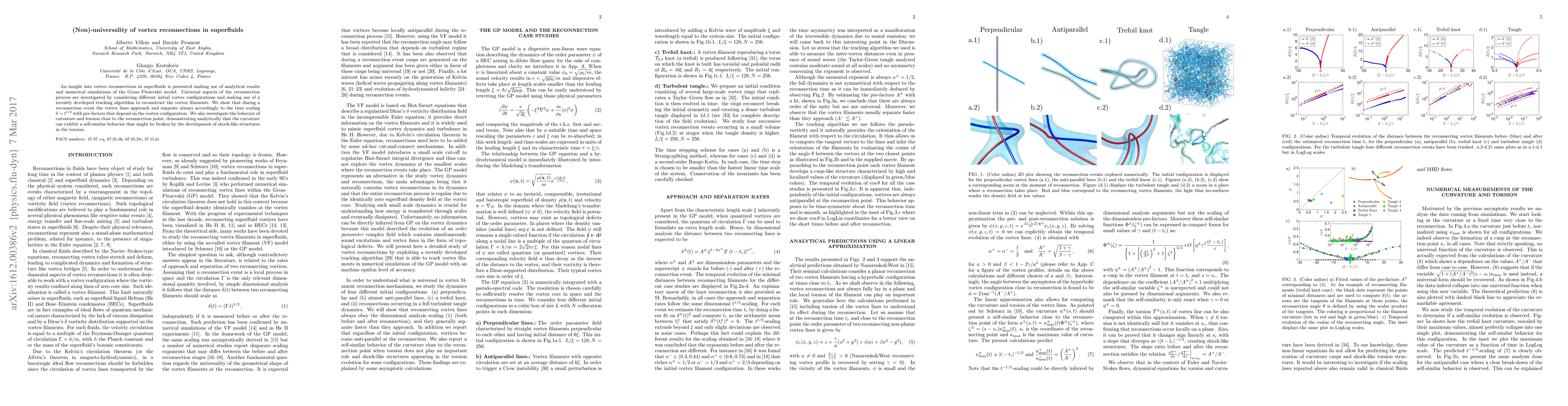 Researchers investigate vortex reconnections in superfluids using analytical results and simulations, finding that the reconnection process follows a time scaling of t^{1/2} with varying pre-factors depending on initial vortex configurations.