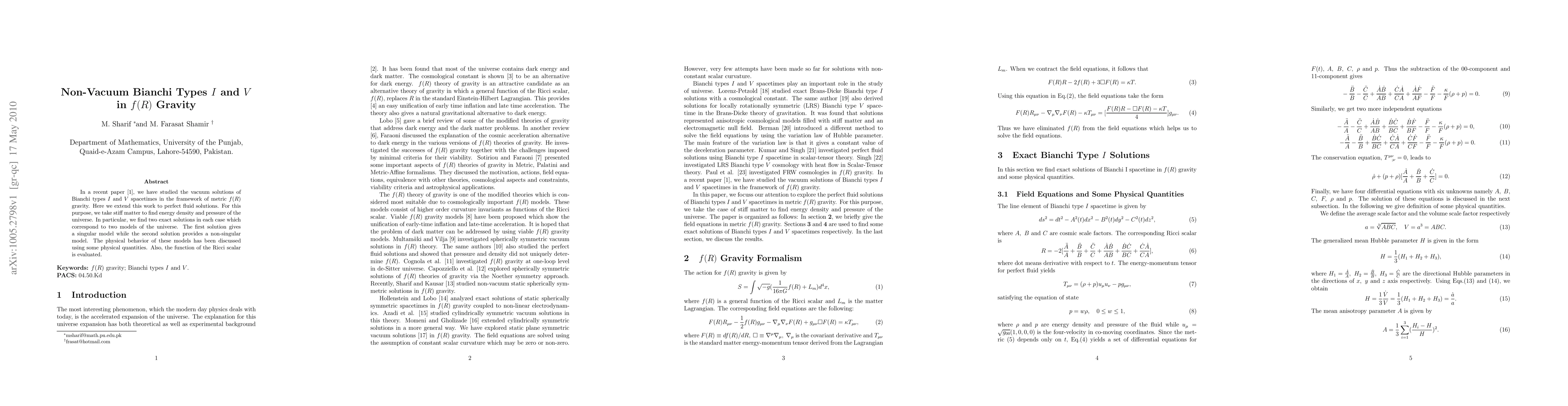 In a recent paper \cite{1}, we have studied the vacuum solutions of Bianchi types I and V spacetimes in the framework of metric f(R) gravity. Here we extend this work to perfect fluid solutions. For this purpose, we take stiff matter to find energy density and pressure of the universe. In particular, we find two exact solutions in each case which correspond to two models of the universe. The first solution gives a singular model while the second solution provides a non-singular model. The physical behavior of these models has been discussed using some physical quantities. Also, the function of the Ricci scalar is evaluated.