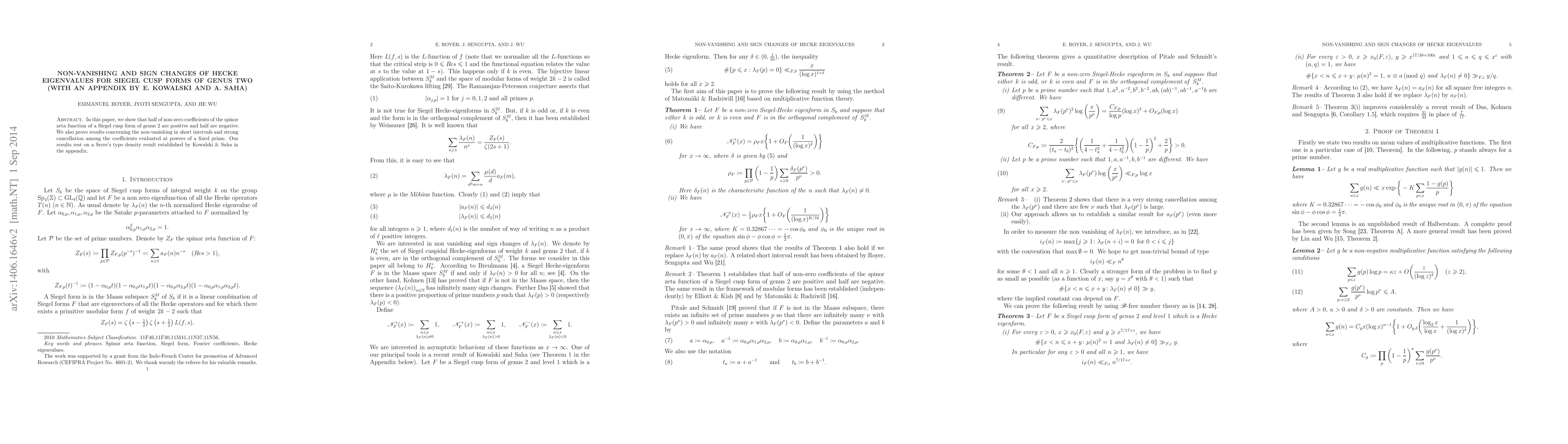 This paper demonstrates that the non-zero Hecke eigenvalues of a Siegel cusp form of genus two exhibit non-vanishing properties and sign changes, with half being positive and half negative. An appendix by E. Kowalski and A. Saha provides additional insights.