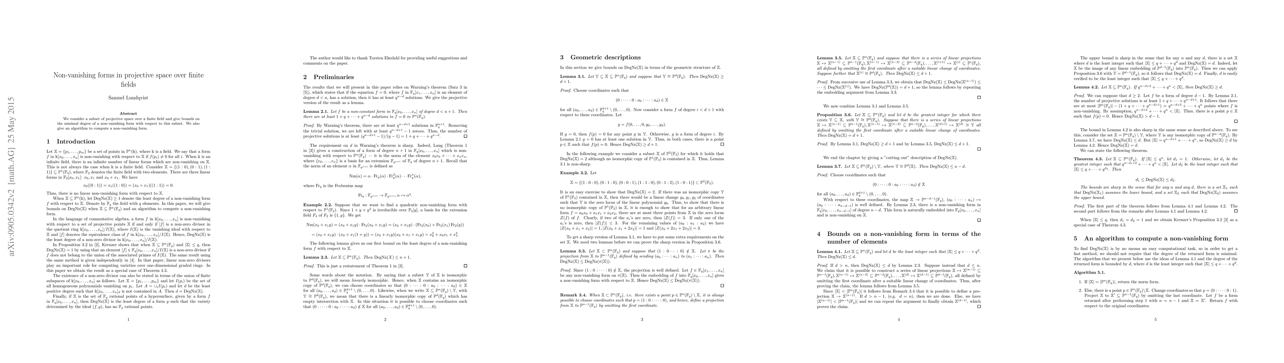 Summary: This paper investigates projective space over finite fields, focusing on subsets and providing bounds for the minimal degree of non-vanishing forms within these subsets. The study aims to understand the geometric properties of these forms.