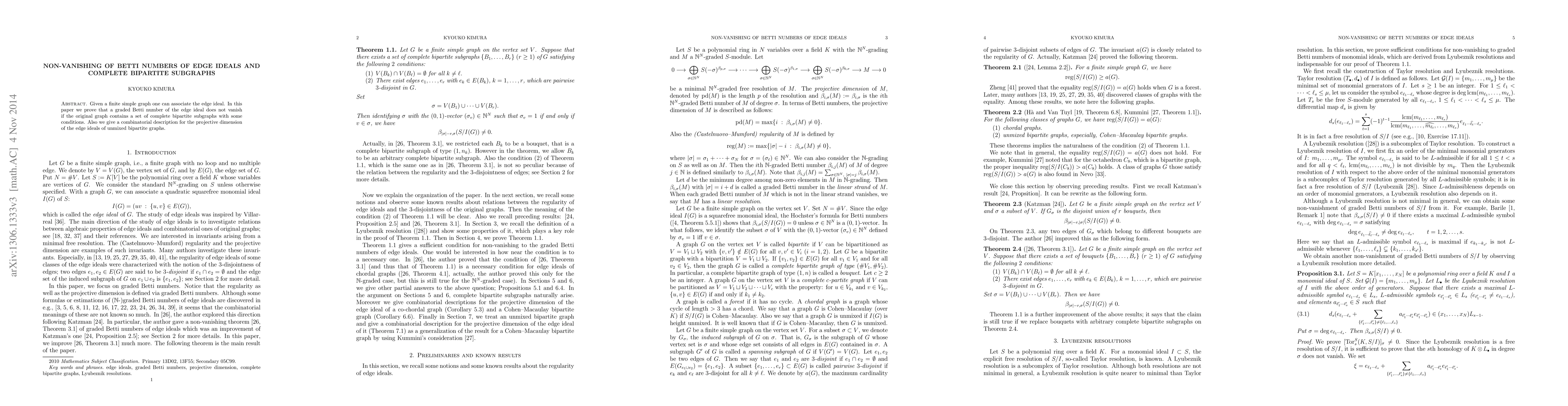 Summary: This paper proves that the graded Betti numbers of edge ideals in finite simple graphs remain non-zero when the graph contains specific complete bipartite subgraphs, and provides a combinatorial explanation for the projective dimension of edge ideals in unmixed bipartite graphs.