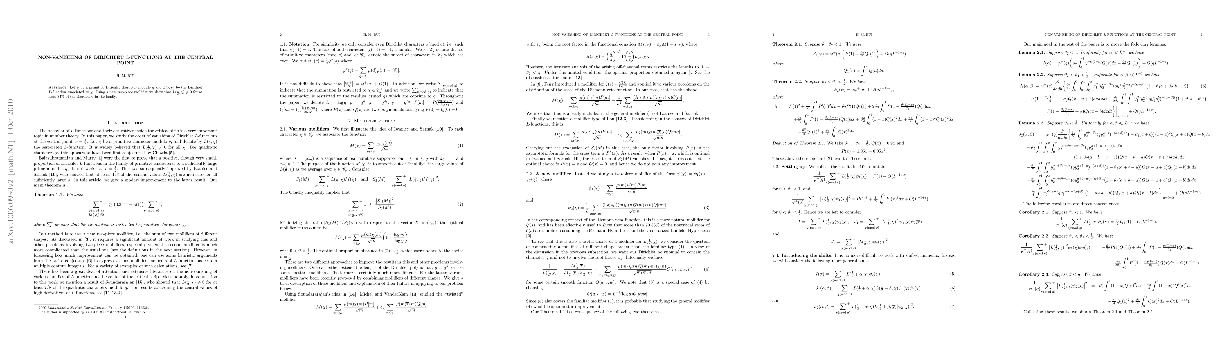 Let $\chi$ be a primitive Dirichlet character modulo $q$ and $L(s,\chi)$ be the Dirichlet L-function associated to $\chi$. Using a new two-piece mollifier we show that $L(\tfrac{1}{2},\chi)\ne0$ for at least 34% of the characters in the family.
