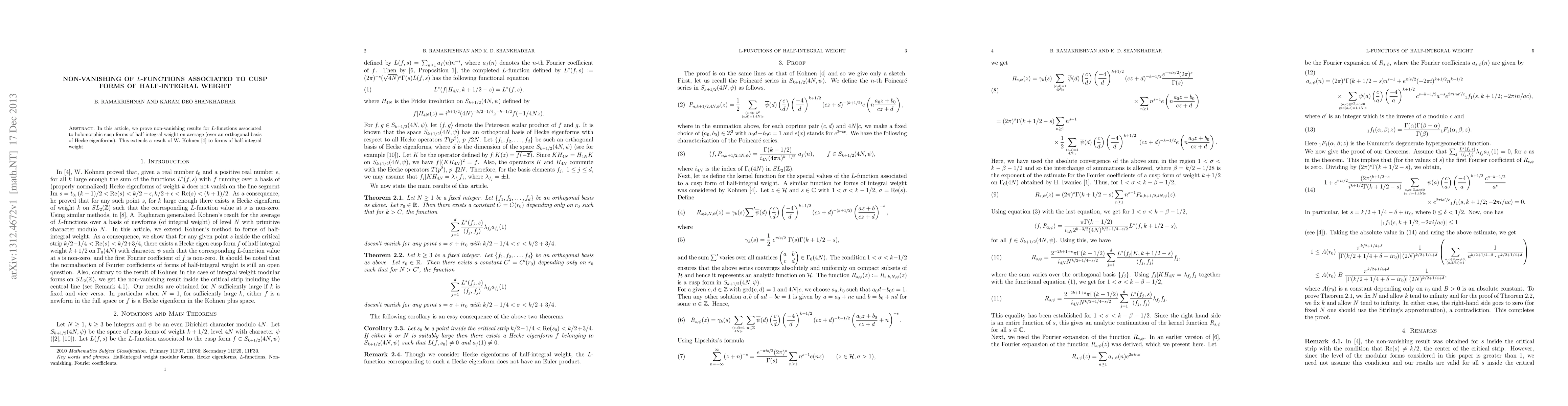 Summary: This paper proves non-vanishing results for $L$-functions linked to holomorphic cusp forms of half-integral weight on average, extending Kohnen's results to this specific class of forms.