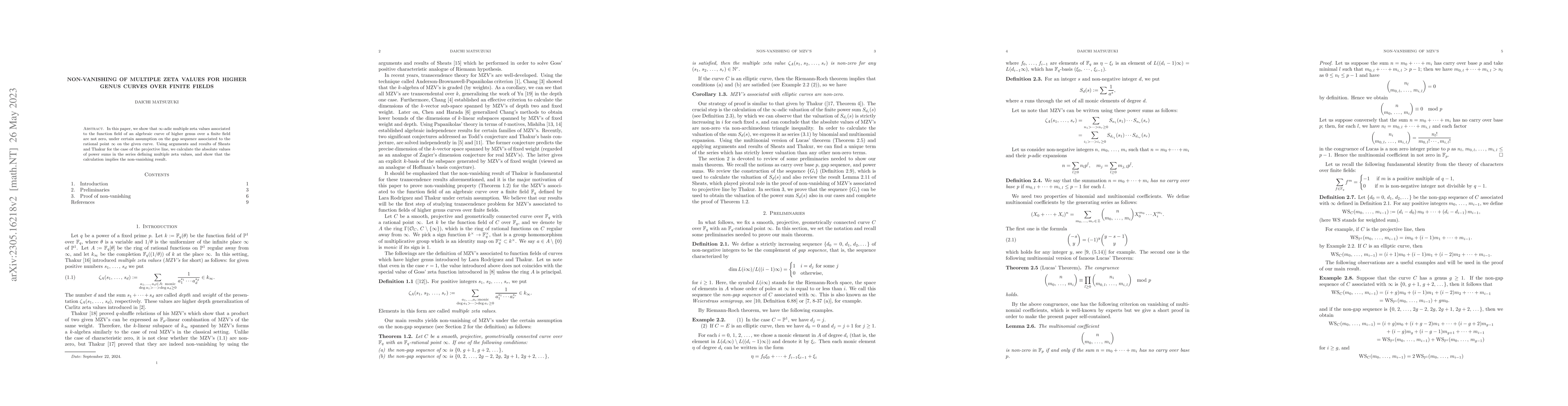 Summary: This paper demonstrates that $\infty$-adic multiple zeta values for higher genus curves over finite fields are non-zero, provided certain conditions on the gap sequence at the rational point $\infty$. It builds on Sheats and Thakur's work for projective lines to prove this result through calculations of absolute values of power sums.